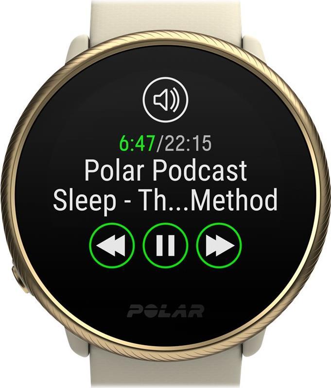 HRmax, HR-Zonen, Inaktivitätsalarm, kontinuierliche Herzfrequenzmessung, Serene (Atemübung), Steuerung der Musikwiedergabe, Wetterinformationen, Nightly Recharge Erholungsmessung, FitSpark Trainingsanleitung, Polar Precision Prime Sensor-Fusionstechnologie