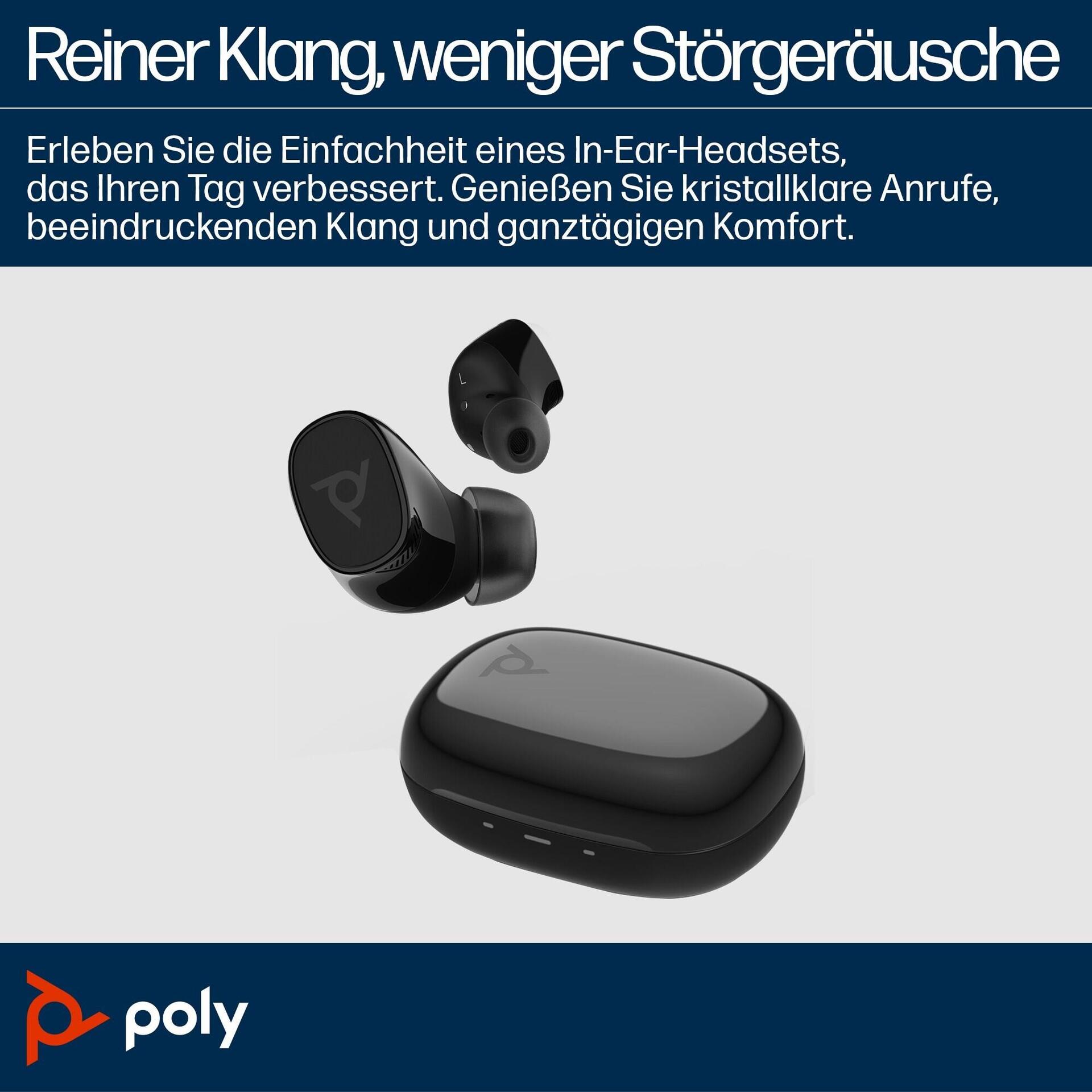 Mit diesen anwenderfreundlichen True Wireless-In-Ear-Headsets sind Sie optimal für den Alltag ausgestattet. Dank ANC bleiben Sie konzentriert, während die legendäre Audioqualität von Poly einen hervorragenden Klang Ihrer Musik und Ihrer Gespräche gewährleistet. Und mit dem individuell anpassbaren Tragekomfort fühlen Sie sich den ganzen Tag über wohl.