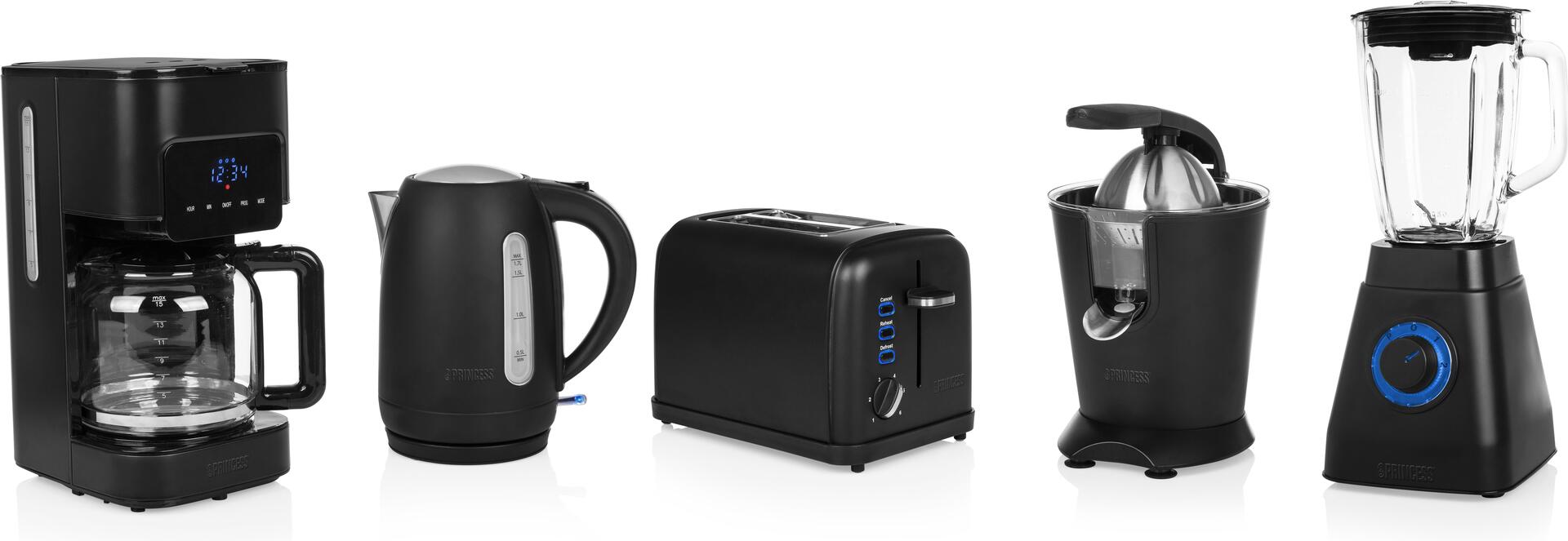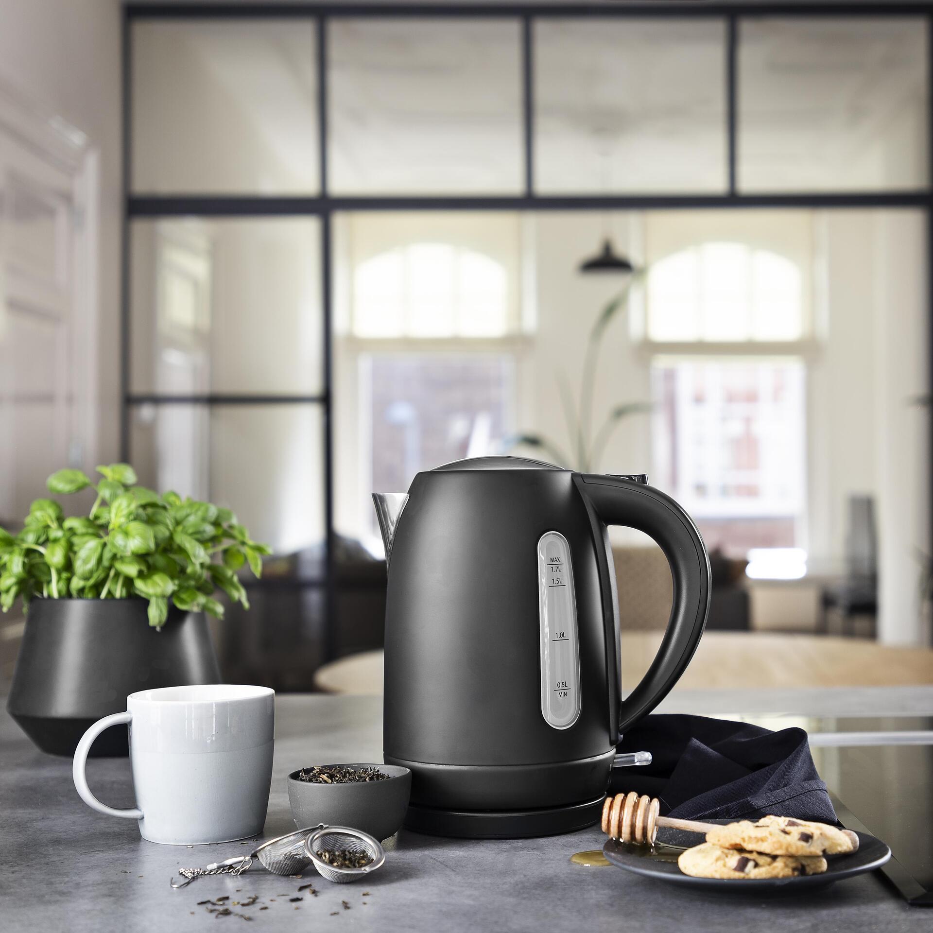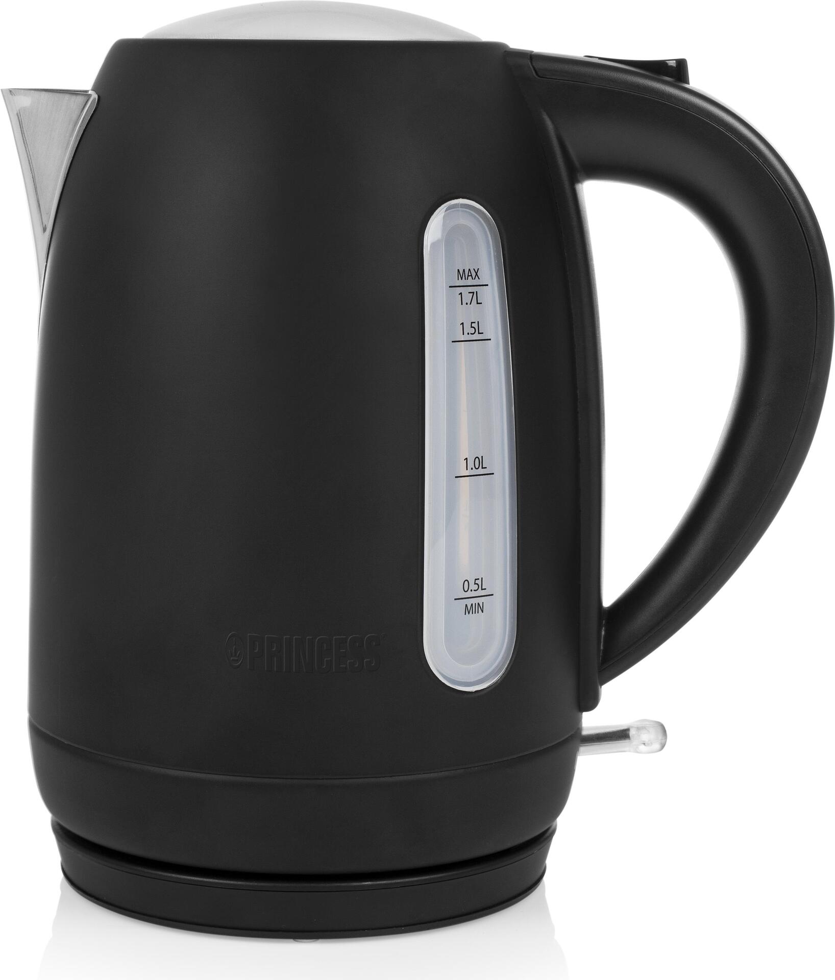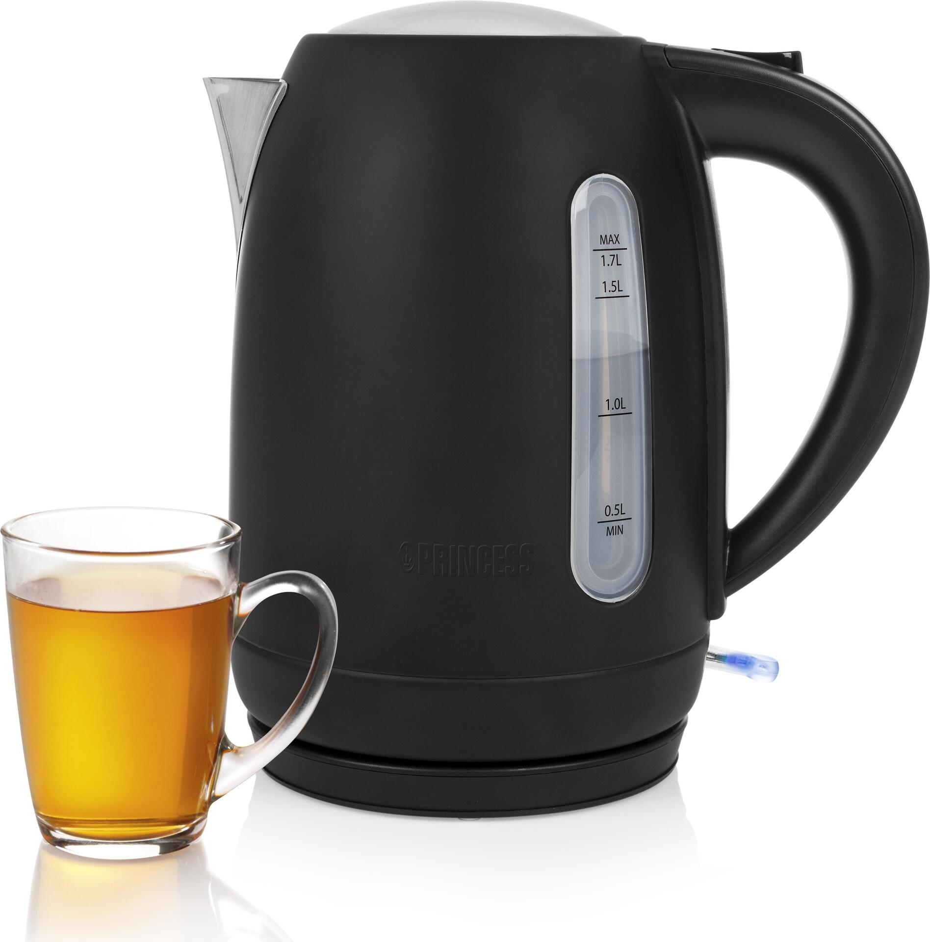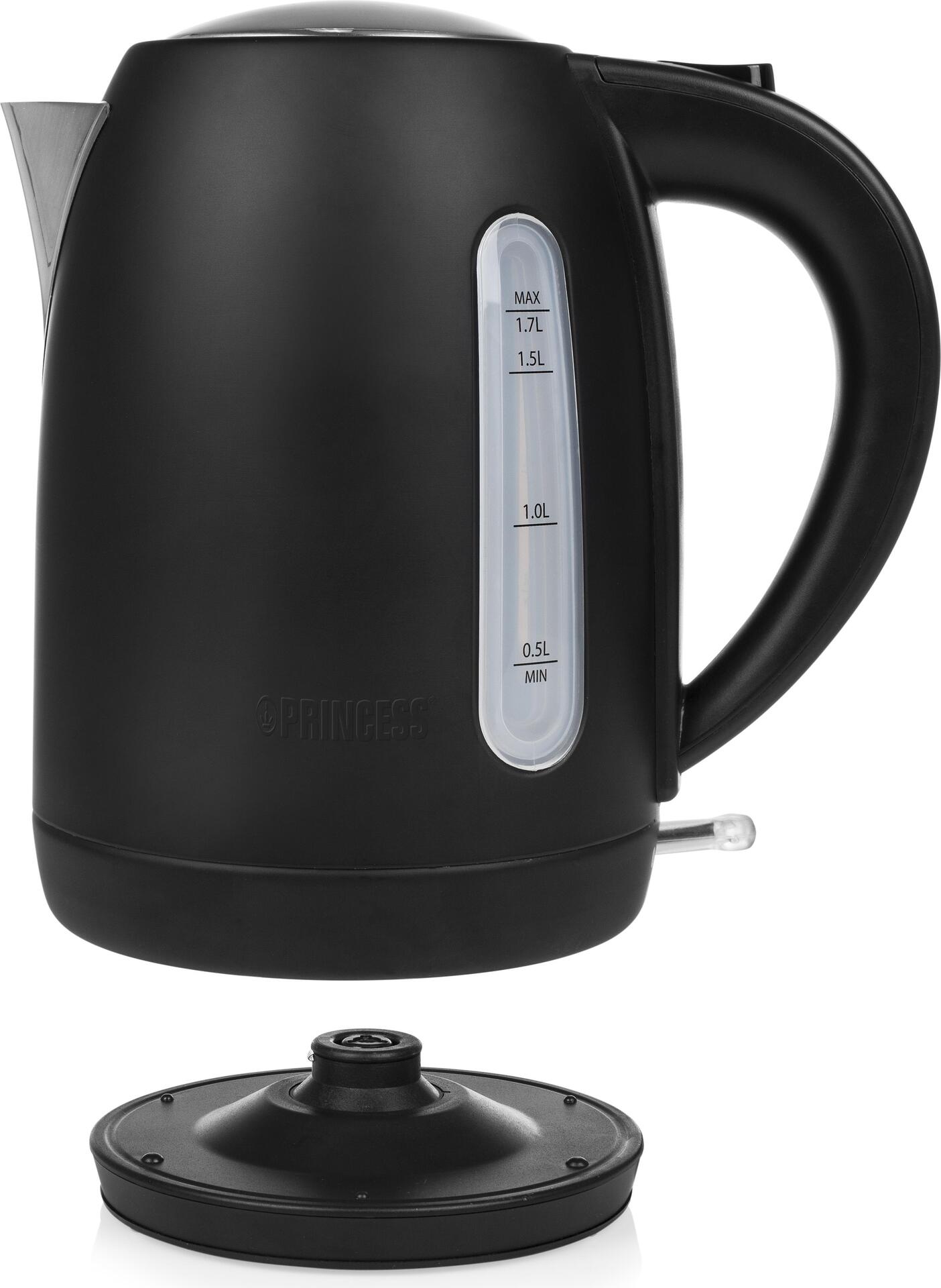 Dieser elegante Princess Wasserkocher mit mattschwarzem Gehäuse ist ein moderner Teekocher mit einem besonders großen Fassungsvermögen von 1,7 l. Kochen Sie sich einen ganzen Topf voll Tee oder bereiten Sie das Kochwasser für Ihre Pasta vor. Dank kabellosem Design und dreifacher Absicherung lässt sich der Princess-Wasserkessel leicht bedienen und jahrelang funktionstüchtig halten.