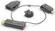 Der IQ-AR100 ist ein HDMI Adapterring mit insgesamt drei verschiedenen HDMI Adaptern, die über vergoldete Präzisions-Steckkontakte verfügen. Die Adapter konvertieren das Signal von DisplayPort, mini DisplayPort bzw. USB-C Stecker auf je eine HDMI Buchse. Unterstützt werden Auflösungen bis zu 4K UltraHD 30 Hz (USB-C) bzw. FullHD 1080p (DP, mini DP). Alle Adapter sind mit einem 40 cm langen, schwarz beschichteten Stahlkabel verbunden. Dieses verfügt über ein selbst entwickeltes, wiederverwendbares Kabelverschluss und -befestigungssystem, das es ermöglicht, sowohl die Adapter am Stahlkabel als auch den gesamten Adapterring z. B. an einem Übertragungskabel zu befestigen.