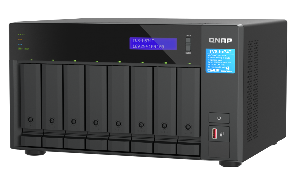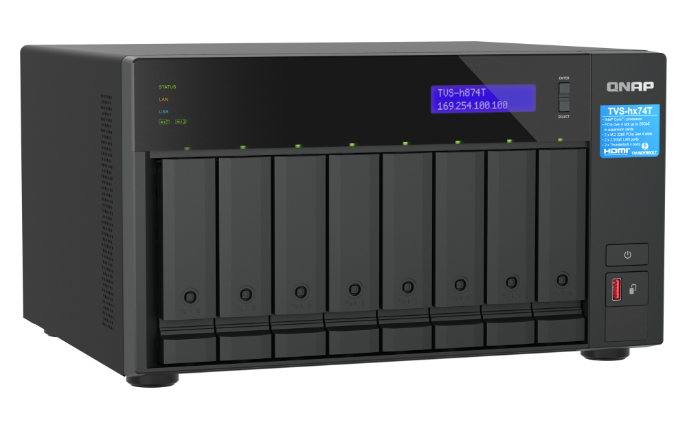 Der QNAP TVS-h874T NAS-Server ist eine leistungsstarke und vielseitige Speicherlösung, die die Anforderungen anspruchsvoller Datenumgebungen erfüllt. Er bietet eine breite Palette von Funktionen, einschließlich flexibler Speicheroptionen mit acht Hot-Swap-Einschüben, die sowohl 2,5"- als auch 3,5"-Laufwerke unterstützen und Skalierbarkeit und Leistung gewährleisten. Konnektivität ist eine der Stärken des TVS-h874T, der mit USB 3.2 Gen 2, 2,5 Gigabit Ethernet, HDMI und Thunderbolt 4 Schnittstellen ausgestattet ist, die Hochgeschwindigkeitsdatenübertragungen und diverse Peripherieanschlüsse ermöglichen.