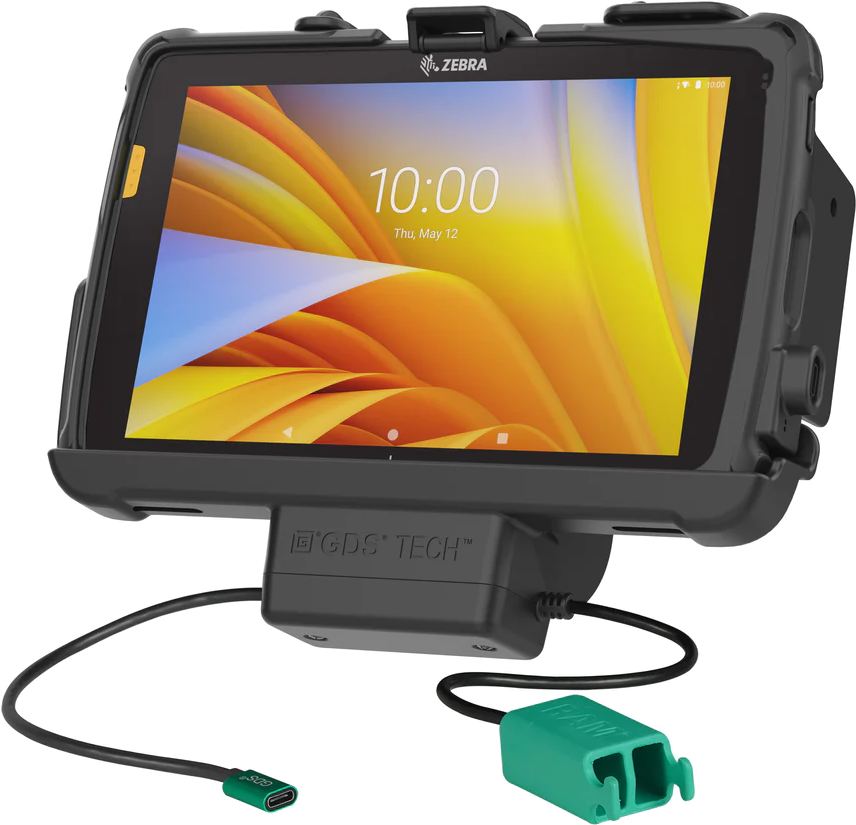RAM Mounts GDS EZ-Roll'r Halteschale für Zebra ET40/45 (8') Diese RAM Mounts GDS EZ-Roll?r Halteschale ist für die Zebra ET4x 8 Zoll Serie mit IntelliSkin Next Generation Schutzhülle geeignet.Die Halteschale wird durch einen USB-C Anschluss mit Strom versorgt und lädt das Gerät in dem Dock auf.Peripheriegeräte werden über den integrierten Dual USB-A Anschluss unterstützt.Zum Einlegen wird die Unterseite des Gerätes in die Halteschale eingelegt und bis zum Einrasten in die Halteschale gedrückt.Durch die Aussparungen an den Tasten und Anschlüssen können diese weiterhin ohne Einschränkungen genutzt werden.Die Halteschale ermöglicht auch durch die Aussparung der Innenseite, dass die Scanfunktion des Tablets weitergenutzt werden kann.Tablet Zubehör wie z.B. PowerPack Akku können hier zusätzlich untergebracht werden. Die Rückseite der Gerätehalteschale ist für die Aufnahme einer VESA 75x75 mm oder runden Basisplatte (nicht im Lieferumfang enthalten) vorbereitet.Produktmerkmale RAM Mounts RAM-GDS-DOCK-ZE20PD2U:Kompatibel mit PowerPack AkkuLeichtes Einlegen und einfache EntnahmeZusätzliche Montageplatte für die Befestigung zusätzlicher Geräte oder ZubehörNur mit IntelliSkin Next Generation Schutzhülle nutzbarAnschlussbuchse: USB-CAusgangsleistung: 60WAusgangsspannung: 5-20V @ 3AAusgangsbuchse: 2x USB-A 2.0 (Peripheriegerät - 900mAh per Port)Übertragungsgeschwindigkeit: 12MbpsEingangs-Kabellänge: ca. 21 cmAusgangs-Kabellänge: ca. 21 cmZertifikate: RoHS, WEEE, CE & UKCAZusätzlicher Hinweis: Für eine Nutzung der Halterung benötigen Sie die RAM-GDS-SKIN-ZE20C-NG Schutzhülle.Abgebildete Geräte gehören nicht zum Lieferumfang.Es wird ausschließlich die RAM-GDS-DOCK-ZE20PD2U Halteschale geliefert. (RAM-GDS-DOCK-ZE20PD2U)