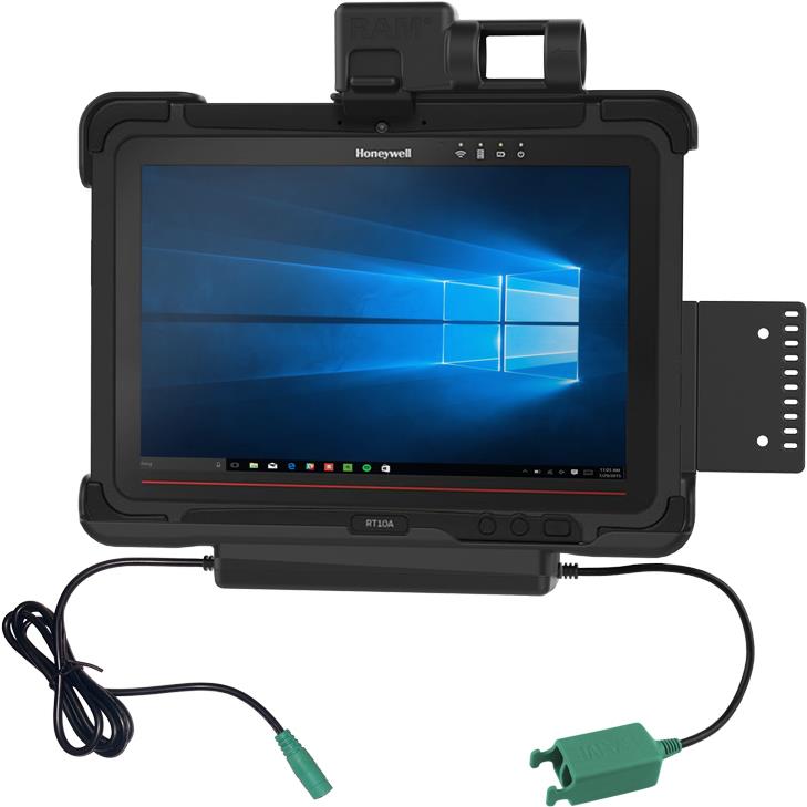 RAM Mounts Form-Fit Halteschale (Schnappverschluss) für Honeywell RT10 Diese RAM Mounts Form Fit (Schnappverschluss) Halteschale ist für das Honeywell RT10 Rugged Tablet geeignet. Die Halteschale wird durch einen 5.5mm DC-Anschluss mit Strom versorgt und lädt das Gerät in dem Dock auf.Peripheriegeräte werden über den integrierten Dual USB-A Anschluss unterstützt.Zum Einlegen wird die Unterseite des Gerätes in die Halteschale eingelegt und bis zum Einrasten in die Halteschale gedrückt.Durch die Aussparungen an den Tasten und Anschlüssen können diese weiterhin ohne Einschränkungen genutzt werden.Die Halteschale ermöglicht auch durch die Aussparung der Rückseite, dass die Scanfunktion des Tablets weitergenutzt werden kann.Tablet Zubehör wie z.B. Handschlaufe oder PowerPack Akku können hier zusätzlich untergebracht werden. Die Rückseite der Gerätehalteschale ist für die Aufnahme einer VESA 75x75 mm oder runden Basisplatte (nicht im Lieferumfang enthalten) vorbereitet.Produktmerkmale RAM Mounts RAM-HOL-HON9PD2U:Kompatibel mit Zubehör z.B. Handschlaufe oder erweiterte BatterieLeichtes Einlegen und einfache EntnahmeLadefunktionSchnappverschlussVorbereitet für die Montage weiterer Geräte wie z.B. HandheldsAnschlussbuchse: 5.5mm DC-BuchseAusgangsbuchse: 2x USB-A 2.0 (Peripheriegerät - 900mAh per Port)Übertragungsgeschwindigkeit: 12Mbps Zusätzlicher Hinweis: Abgebildete Geräte gehören nicht zum Lieferumfang.Es wird ausschließlich die RAM-HOL-HON9PD2U Halteschale geliefert. (RAM-HOL-HON9PD2U)