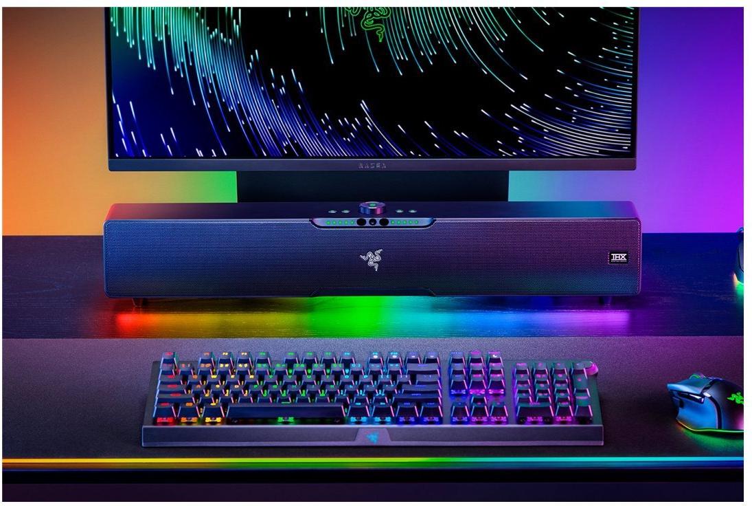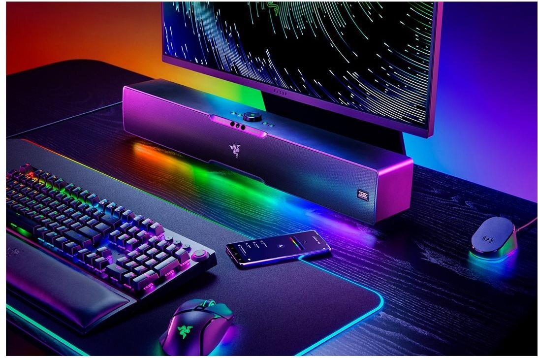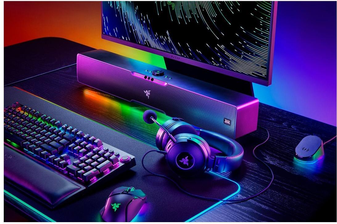 Die Razer Leviathan 5.1-Kanal Surround-Soundbar passt problemlos unter jeden Desktop-Monitor oder Konsolenaufbau im Wohnzimmer. Vielseitig genug, um immer wieder neu positioniert zu werden, bietet diese Soundbar hochmoderne Dolby-Technologie, überragende Sound-Treiber und einen eigenen Subwoofer, so dass ein voller Klang erzeugt wird, der epische Kampfszenen im Spiel genau wiedergibt oder einfach nur deine Lieblingslieder von deinem Smartphone streamt.