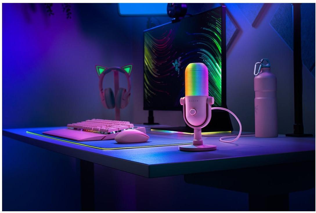 Die Konnektivität ist nahtlos mit USB, und das abnehmbare USB-C-auf-USB-A-Kabel bietet Flexibilität in Ihrem Setup. Das Design des Mikrofons ist nicht nur funktional, sondern auch ästhetisch ansprechend und verfügt über eine anpassbare RGB-Beleuchtung, die sich an Ihr Setup oder Ihre Stimmung anpasst. Darüber hinaus bieten der integrierte Geräuschdämpfer und die berührungsempfindliche Stummschaltfunktion Komfort und Kontrolle und machen das Razer Seiren V3 Chroma zu einer herausragenden Wahl für alle, die Wert auf ihr Audioerlebnis legen.