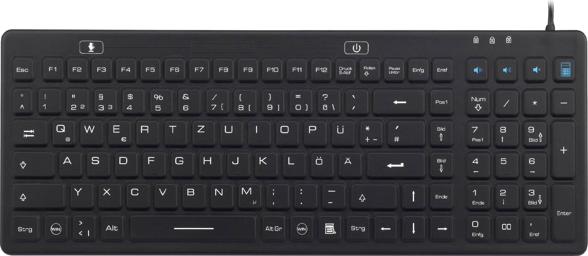Diese Tastatur ist IP68-zertifiziert und verfügt über eine wasserdichte und waschbare Silikonoberfläche. Sie besitzt einen Ein-/Ausschalter, so dass die Tastatur nicht vom PC getrennt werden muss, um gereinigt werden zu können.
