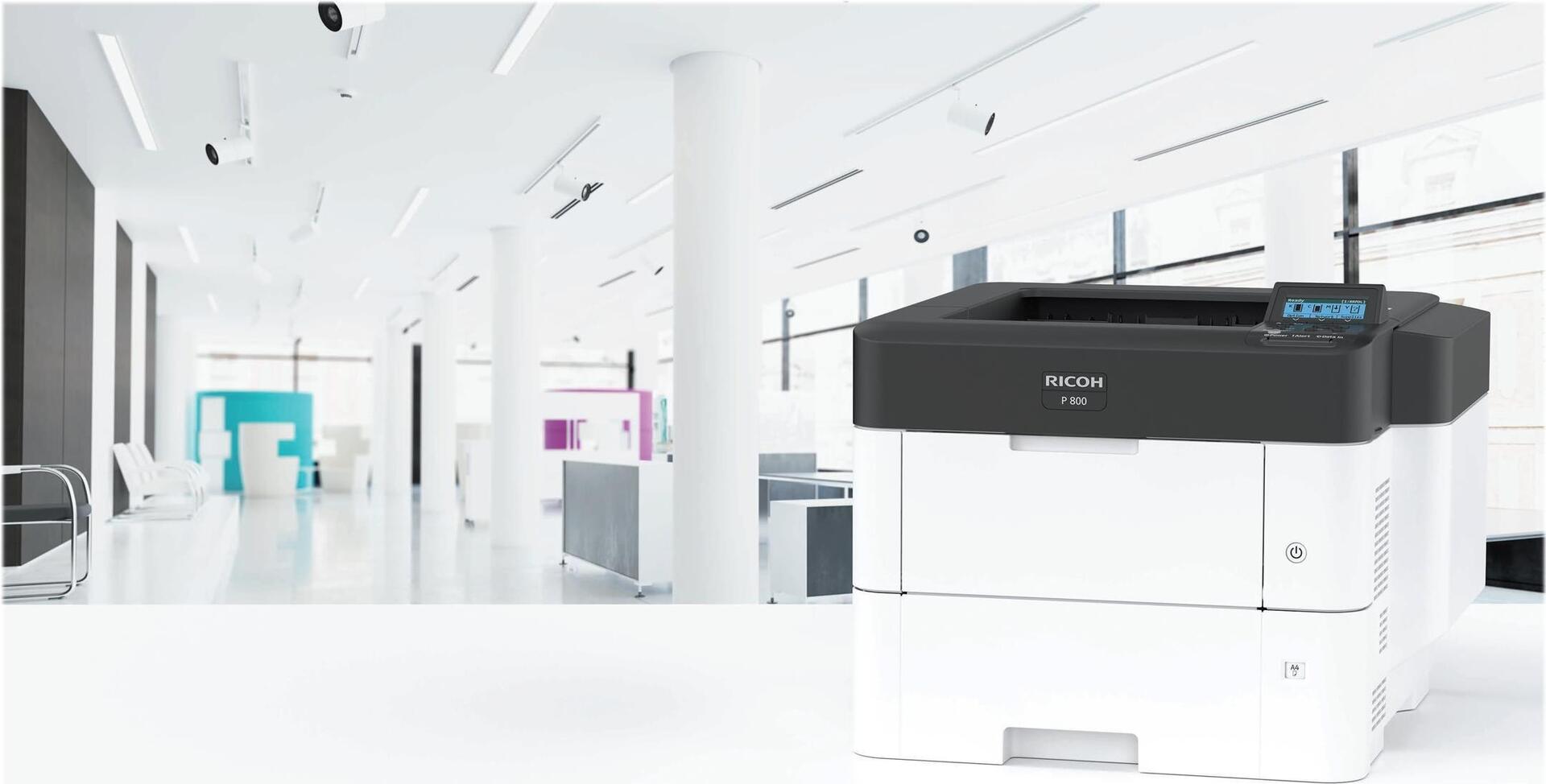 Der Ricoh P 800 ist ein robuster S/W-Drucker, der mit 55 Seiten pro Minute auch höchste Anforderungen an Druckgeschwindigkeit und -volumen erfüllt. Das A4-System ist äußerst platzsparend und lässt sich leise im Hintergrund betreiben - ideal für das Aufstellen an einem zentralen Punkt Ihres Betriebs. Langlebige Komponenten und ein Toner mit hoher Reichweite minimieren den Wartungsaufwand und der problemlose Wechsel zwischen den Papiermagazinen garantiert einen zuverlässigen Nonstop-Betrieb.