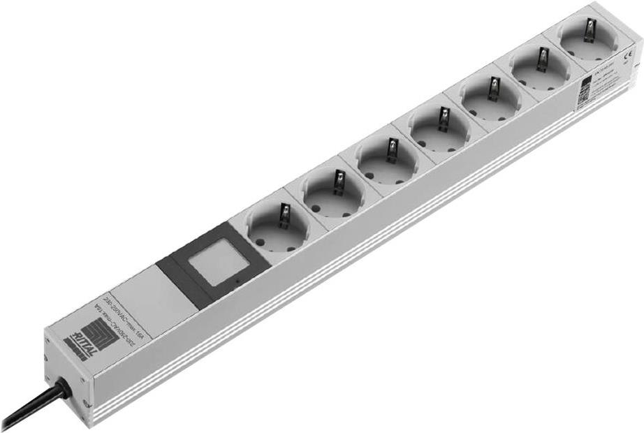 Die Steckdosenleiste 7x CEE 7/3 (Typ F - Schutzkontaktsteckdose) mit integriertem Display misst die Energieaufnahme aller angeschlossenen Verbraucher. Die 482,6 mm (19") lange Steckdosenleiste ist wahlweise an den 19"-Montagerahmen, am Gehäuserahmen oder im hinteren Bereich der Wandverteiler zu montieren. Der Einbauwinkel lässt sich in vier unterschiedlichen Positionen montieren und stellt eine variable Montage sicher. Ohne zusätzliches Befestigungszubehör kann die Steckdosenleiste an allen Profilen mit 25 mm-Maßraster eingesetzt werden.