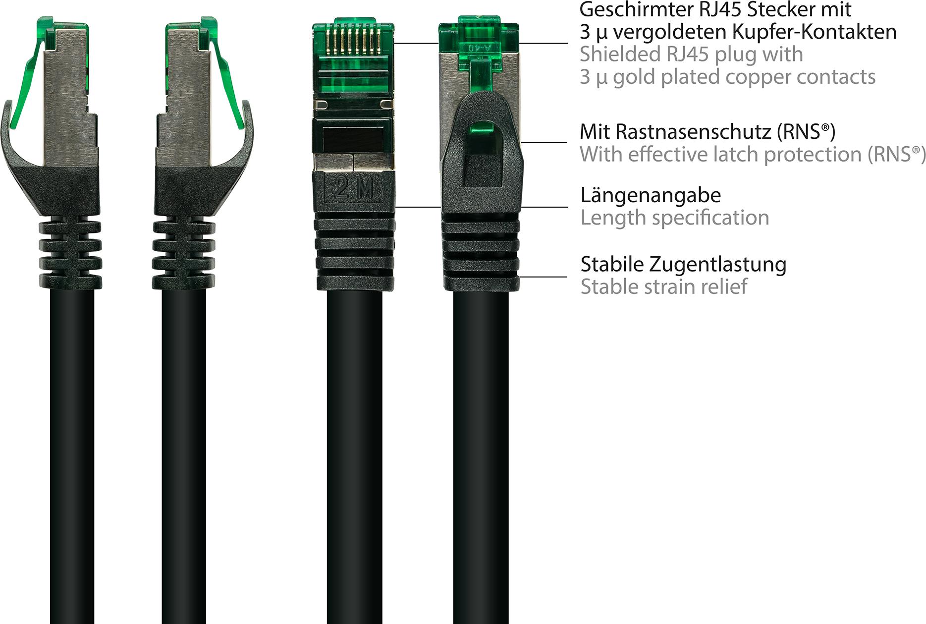 RNS® Patchkabel mit Rastnasenschutz, Outdoor (IP66), Cat.6A, S/FTP, PiMF, 500MHz, CU, schwarz, 30 m, Good Connections®