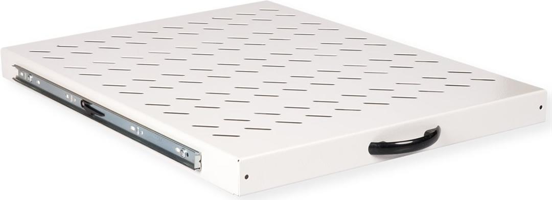 ROLINE 19 Zoll Fachboden 1 HE ausziehbar 550 T 25 kg grau Die ausziehbaren Fachböden lassen sich mühelos an den vier 19"-Profilschienen Ihrer 19"-Schränke montieren. Sie bestehen aus stabilem, perforiertem Lochblech mit hoher Tragfähigkeit und bieten somit eine ideale Ablagefläche für Ihre Komponenten. Ein im Lieferumfang enthaltener Griff kann angebracht werden, um das Ausziehen zu erleichtern. Die Fachböden sind in den Farben Grau (RAL 7035) und Schwarz (RAL 9005) erhältlich.