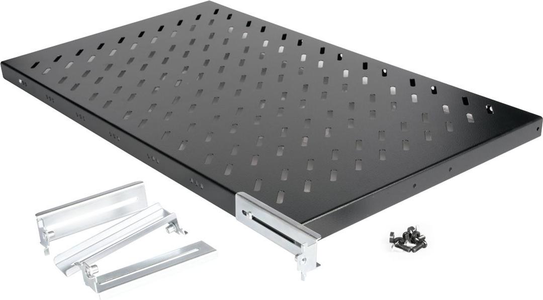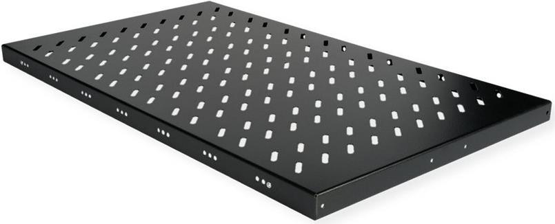 ROLINE 19 Zoll Fachboden 1 HE 770 T 50 kg schwarz Die fest installierbaren Fachböden können problemlos an den vier 19"-Profilschienen Ihres 19" Netzwerk- oder Serverschrankes angebracht werden. Sie bestehen aus stabilem, perforiertem Lochblech und haben eine Traglast von bis zu 50 kg, was sie zur idealen Ablagefläche für Komponenten macht, die nicht 19"-einbaufähig sind. Die Befestigungsschienen lassen sich bei Bedarf verstellen.