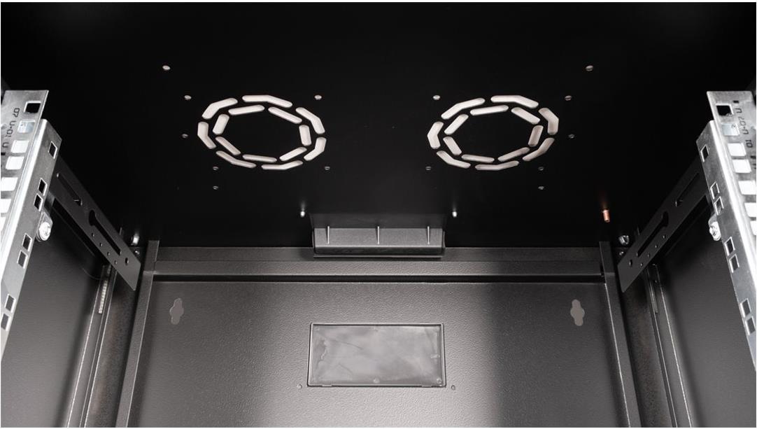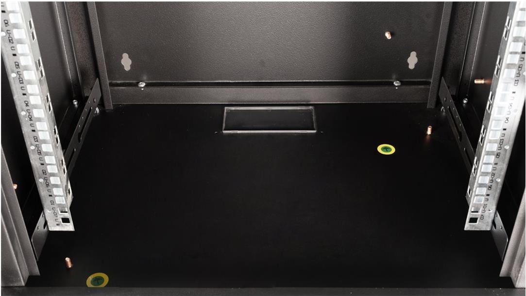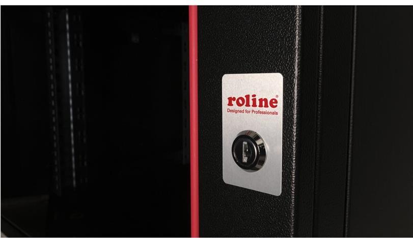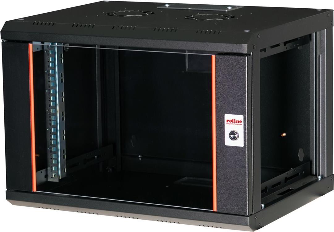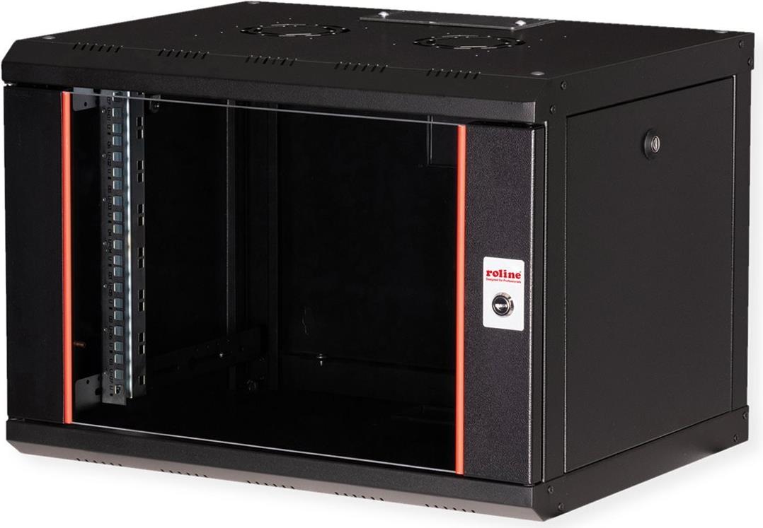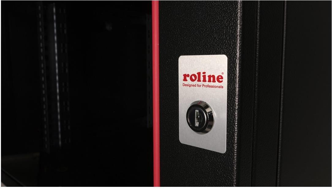ROLINE 19 Zoll Wandgehäuse Pro 7 HE 600x450 BxT schwarz Die Wandgehäuse der ROLINE Pro Serie wurden speziell für eine flexible Netzwerkverkabelung konzipiert. Jeder Schrank verfügt über einen aufschiebbaren Kabeleinlass im Dach mit Moosgummidichtung. Die Rückwand und das Bodenblech sind mit ausgestanzten Kabeleinlässen und Kunststoffabdeckungen ausgestattet. Das Dachchassis bietet einen ausgestanzten Bereich zur Aufnahme eines Lüftermoduls. Im Inneren sind ein Paar galvanisierte Profilschienen mit Höheneinheiten von 483 mm (19") verbaut, die zusätzlich in der Tiefe verstellbar sind. Die robusten Stahlkonstruktionen der Schränke bestehen aus bis zu 1,5 mm starkem Stahlblech und sind in Grau (RAL 7035) oder Schwarz (RAL 9005) pulverbeschichtet erhältlich. Die Seitenwände und die Fronttür sind modular abschließ- und abnehmbar, was die Zugänglichkeit verbessert. Die Wandmontage erfolgt in zwei einfachen Schritten: Zuerst wird die Rückwand an die Wand geschraubt und dann mit dem Gehäuse verbunden. Optional können Nivellierfüße oder Rollen verwendet werden, um die Schränke freistehend zu nutzen. • Traglast: 100 kg • Fronttür aus gehärtetem Glas, abschließbar • 1-Punkt-Verriegelung an der Fronttür • Seitenteile sind abschließ- und abnehmbar • Kabelzuführung an Rückseite und Boden • Dach mit Austanzung für Lüftermodule • Lüftungsschlitze für passive Be- und Entlüftung • Inkl. Befestigungsmaterial • IP Schutzklasse: IP20.