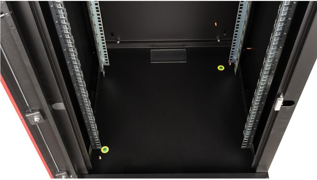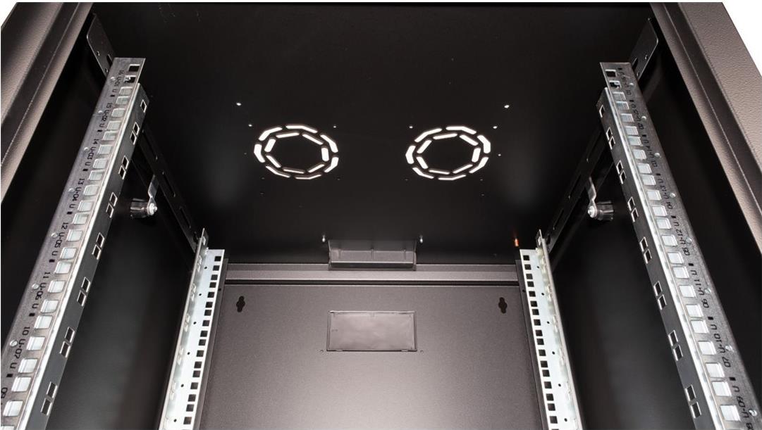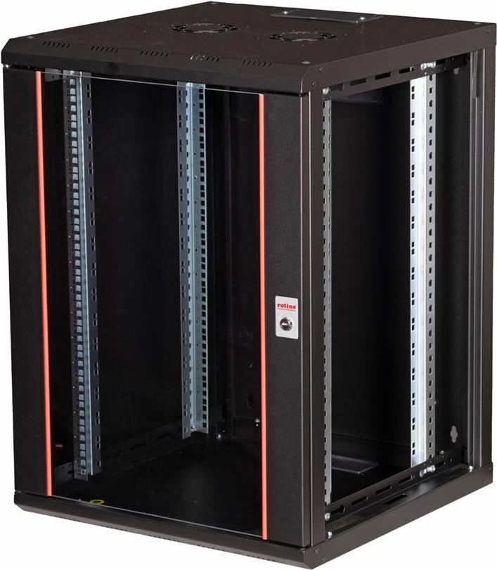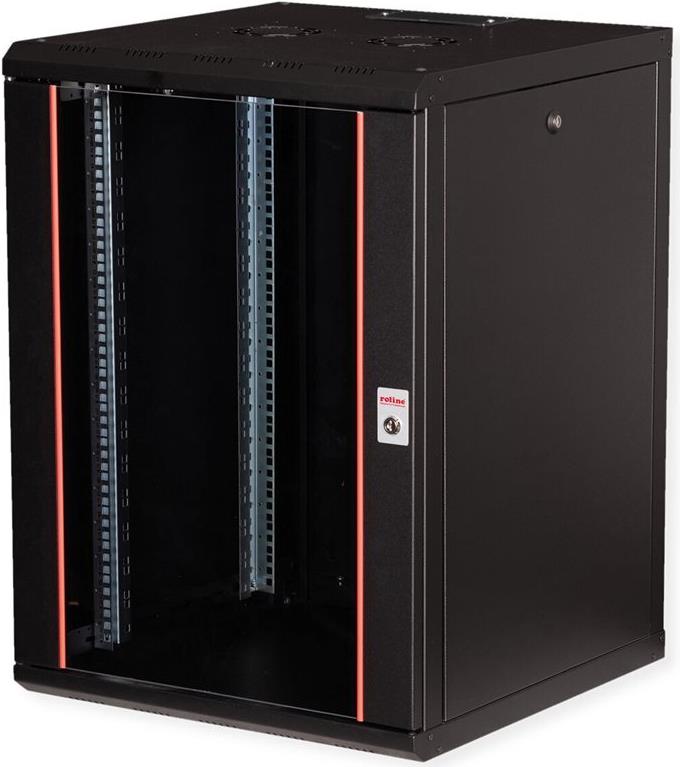 ROLINE 19 Zoll Wandgehäuse Pro 16 HE 600x600 BxT schwarz Die Wandgehäuse der ROLINE Pro Serie wurden speziell für eine flexible Netzwerkverkabelung konzipiert. Jeder Schrank verfügt über einen aufschiebbaren Kabeleinlass im Dach mit Moosgummidichtung. Die Rückwand und das Bodenblech sind mit ausgestanzten Kabeleinlässen und Kunststoffabdeckungen ausgestattet. Das Dachchassis bietet einen ausgestanzten Bereich zur Aufnahme eines Lüftermoduls. Im Inneren sind zwei Paar galvanisierte Profilschienen mit Höheneinheiten von 483 mm (19") verbaut, die zusätzlich in der Tiefe verstellbar sind. Die robusten Stahlkonstruktionen der Schränke bestehen aus bis zu 1,5 mm starkem Stahlblech und sind in Grau (RAL 7035) oder Schwarz (RAL 9005) pulverbeschichtet erhältlich. Die Seitenwände und die Fronttür sind modular abschließ- und abnehmbar, was die Zugänglichkeit verbessert. Die Wandmontage erfolgt in zwei einfachen Schritten: Zuerst wird die Rückwand an die Wand geschraubt und dann mit dem Gehäuse verbunden. Optional können Nivellierfüße oder Rollen verwendet werden, um die Schränke freistehend zu nutzen. • Traglast: 100 kg • Fronttür aus gehärtetem Glas, abschließbar • 1-Punkt-Verriegelung an der Fronttür • Seitenteile sind abschließ- und abnehmbar • Kabelzuführung an Rückseite und Boden • Dach mit Austanzung für Lüftermodule • Lüftungsschlitze für passive Be- und Entlüftung • Inkl. Befestigungsmaterial • IP Schutzklasse: IP20.