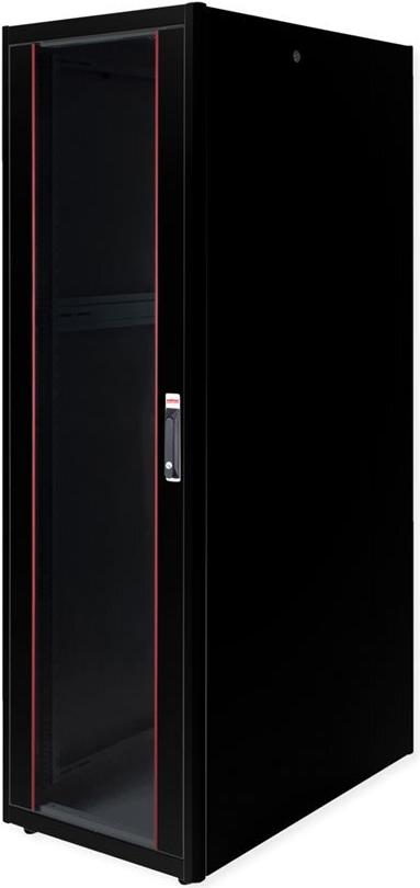 ROLINE 19 Zoll Netzwerkschrank Basic 42 HE 600x1000 BxT Glastür schwarz Die Netzwerkschränke der ROLINE Basic Serie wurden entwickelt, um einen einfachen und besonders kosteneffizienten Netzwerkausbau zu ermöglichen. Durch strategisch platzierte Kabeleinlässe ist eine mühelose Installation je nach Anwendungsfall gewährleistet. Im Bodenchassis befindet sich der Kabeleinlass, der durch eine verschraubte Abdeckplatte geschützt und im hinteren mittigen Bereich positioniert ist. Bei Schränken ab 800 mm Breite werden zusätzliche Kabeleinlässe mit Kunststoffabdeckung links und rechts hinzugefügt. Diese sind auch im Dach integriert (einmal bei 600 mm Schrankbreite, dreimal bei 800 mm Schrankbreite). Für die Installation eines Lüftermoduls ist das Dachchassis ebenfalls mit einem ausgestanzten Bereich versehen. Die Lüftereinheit kann nur von innen installiert und deinstalliert werden. Im Inneren sind zwei Paar galvanisierte 19"-Profilschienen verbaut, die in beide Richtungen ablesbar sind und sich in der Tiefe verstellen lassen. Sie sind zudem mit zusätzlichen Tiefenstreben im Schrank verbunden. Jeder Schrank besteht aus einer robusten Stahlkonstruktion mit einer Materialstärke von bis zu 1,5 mm Stahlblech. Die Farbgebung erfolgt mittels elektrostatischer Pulverbeschichtung in den Standardfarben Grau (RAL 7035) und Schwarz (RAL 9005). Abnehmbare Seiten- und Rückwände sowie eine abschließ- und abnehmbare Fronttür verbessern die Zugänglichkeit. Ein Wechsel des Türanschlags ist möglich. Zudem sind die Schränke aufgrund ihrer zerlegbaren Konstruktion bei Bedarf vollständig demontierbar.