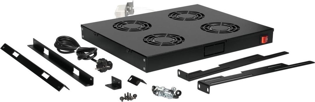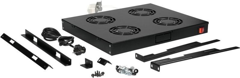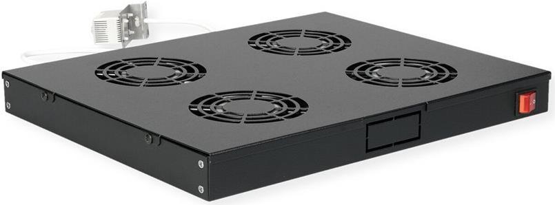 ROLINE 19 Zoll Rackmount-Lüftereinheit 4 Lüfter Thermostat schwarz Die ROLINE Rackmount-Lüftereinheiten können flexibel in jedem 19"-Schrank eingesetzt werden. Jede Lüftereinheit wird mit zwei Sets von Montagewinkeln geliefert. Mit dem ersten Satz können Sie die Lüftereinheit an jeder beliebigen Höheneinheit Ihres Netzwerkschrankes vertikal befestigen. Das zweite Set ermöglicht Ihnen die Installation für den horizontalen Einbau. Ein Schalter sowie ein regelbares Thermostat bieten optimale Anpassungsmöglichkeiten. Das Modell ist in den Standardfarben Grau (RAL 7035) und Schwarz (RAL 9005) erhältlich.