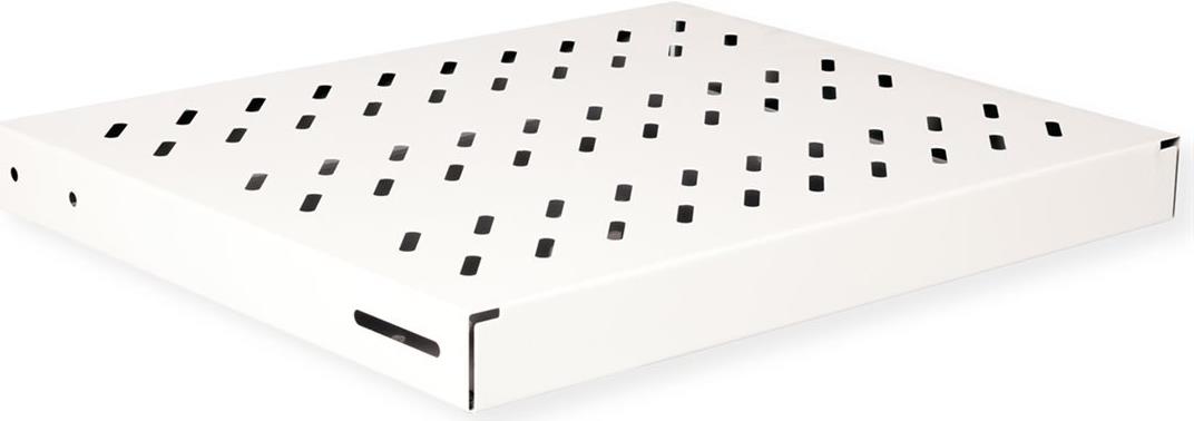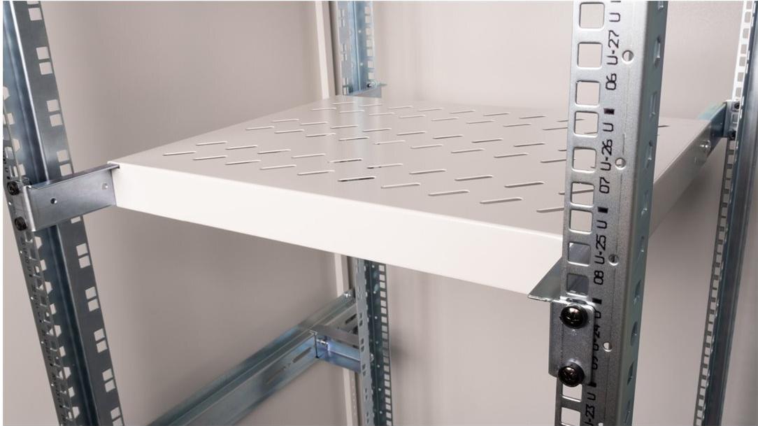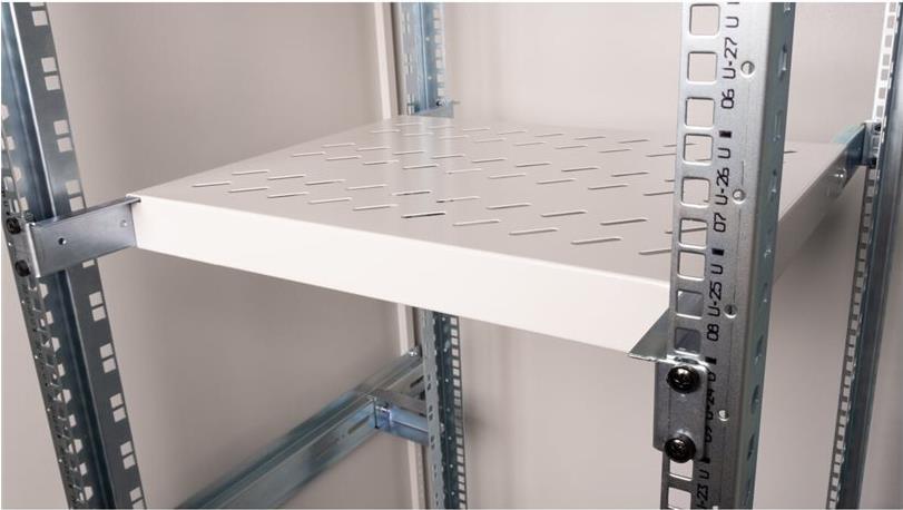 ROLINE 19 Zoll Fachboden 1 HE 350 T 50 kg grau Die fest installierbaren Fachböden können problemlos an den vier 19"-Profilschienen Ihres 19" Netzwerk- oder Serverschrankes angebracht werden. Sie bestehen aus stabilem, perforiertem Lochblech und haben eine Traglast von bis zu 50 kg, was sie zur idealen Ablagefläche für Komponenten macht, die nicht 19"-einbaufähig sind. Die Befestigungsschienen lassen sich bei Bedarf verstellen.