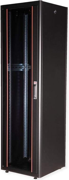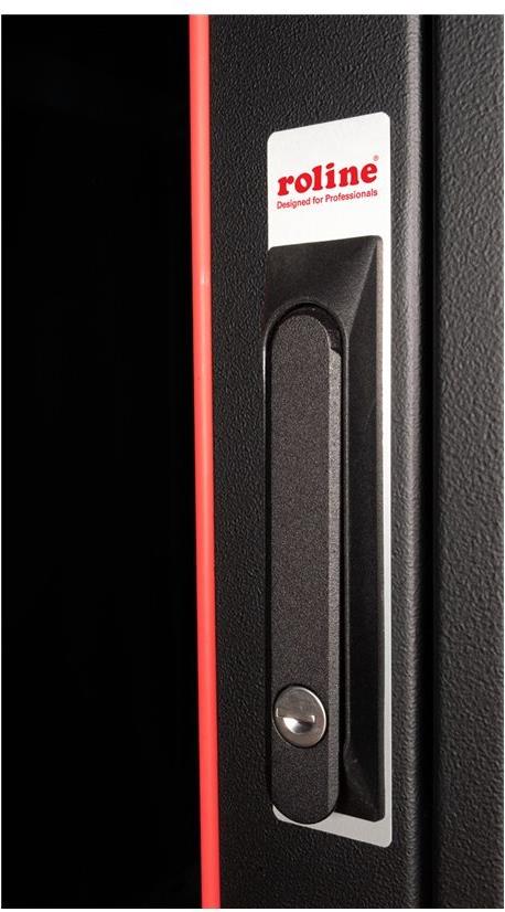 ROLINE 19 Zoll Netzwerkschrank Basic 42 HE 600x600 BxT Glastür schwarz Die Netzwerkschränke der ROLINE Basic Serie wurden entwickelt, um einen einfachen und besonders kosteneffizienten Netzwerkausbau zu ermöglichen. Durch strategisch platzierte Kabeleinlässe ist eine mühelose Installation je nach Anwendungsfall gewährleistet. Im Bodenchassis befindet sich der Kabeleinlass, der durch eine verschraubte Abdeckplatte geschützt und im hinteren mittigen Bereich positioniert ist. Bei Schränken ab 800 mm Breite werden zusätzliche Kabeleinlässe mit Kunststoffabdeckung links und rechts hinzugefügt. Diese sind auch im Dach integriert (einmal bei 600 mm Schrankbreite, dreimal bei 800 mm Schrankbreite). Für die Installation eines Lüftermoduls ist das Dachchassis ebenfalls mit einem ausgestanzten Bereich versehen. Die Lüftereinheit kann nur von innen installiert und deinstalliert werden. Im Inneren sind zwei Paar galvanisierte 19"-Profilschienen verbaut, die in beide Richtungen ablesbar sind und sich in der Tiefe verstellen lassen. Sie sind zudem mit zusätzlichen Tiefenstreben im Schrank verbunden. Jeder Schrank besteht aus einer robusten Stahlkonstruktion mit einer Materialstärke von bis zu 1,5 mm Stahlblech. Die Farbgebung erfolgt mittels elektrostatischer Pulverbeschichtung in den Standardfarben Grau (RAL 7035) und Schwarz (RAL 9005). Abnehmbare Seiten- und Rückwände sowie eine abschließ- und abnehmbare Fronttür verbessern die Zugänglichkeit. Ein Wechsel des Türanschlags ist möglich. Zudem sind die Schränke aufgrund ihrer zerlegbaren Konstruktion bei Bedarf vollständig demontierbar.