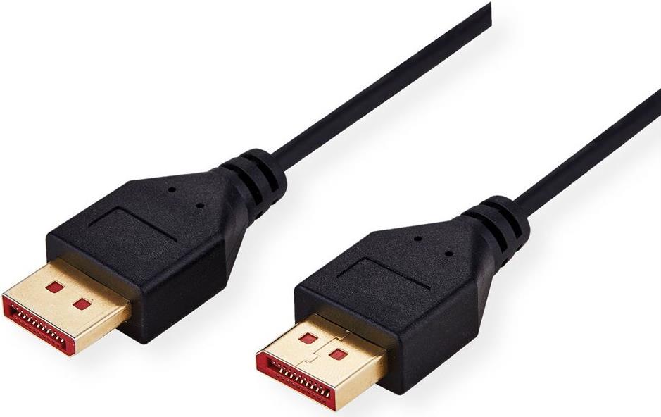 ROLINE DisplayPort Kabel mit beidseitigem DP-Anschluss für das Verbinden eines Ultrabooks, Notebooks/Laptops oder PCs mit einem Monitor, TV, Beamer oder Projektor - für Bildschirmübertragungen in exzellenter Qualität mit einer 8K Auflösung von bis zu 7680x4320 @60Hz! • DisplayPort ist ein universeller Verbindungsstandard für die Übertragung von Bild- und Tonsignalen, der in der Computerbranche, der Industrie und der modernen Hausverkabelung weithin bekannt und geschätzt ist. Die Anwendungen umfassen hauptsächlich den Anschluss von Monitoren oder Projektoren an Computer, Notebooks/Laptops, Ultrabooks, NUCs und ähnliche Geräte. • Der Anschluss benötigt weniger Platz als VGA oder DVI und eignet sich daher besser für tragbare Geräte oder für zwei Anschlüsse an einer Grafikkarte (auf einem Slotblech). • DisplayPort v1.4 unterstützt Display Stream Compression 1.2a (DSC), Vorwärtsfehlerkorrektur und den HDR10-Standard. • DP v1.4 kann eine maximale Auflösung von 8K (7680x4320) @60Hz oder 4K (3840x2160) @120Hz erreichen. • Das praktische Steckerdesign verhindert das Herausrutschen des Kabels aus der DisplayPort-Buchse und garantiert eine stabile Videoübertragung. Ihr besonderer Nutzen • Dieses spezielle Kabel hat einen schlanken Außendurchmesser, um eine noch flexiblere Verkabelung und den Einsatz unterwegs zu ermöglichen. • Die roten Steckerfüllungen kennzeichnen das Kabel als qualitativ hochwertiges Produkt und können helfen, es in einer Umgebung mit vielen verschiedenen DisplayPort-Kabeln schnell zu identifizieren.