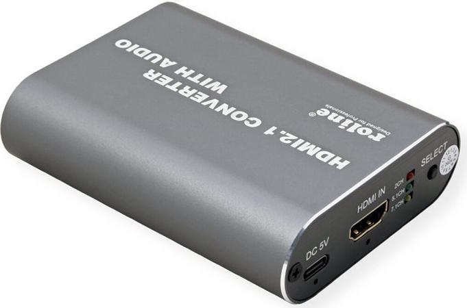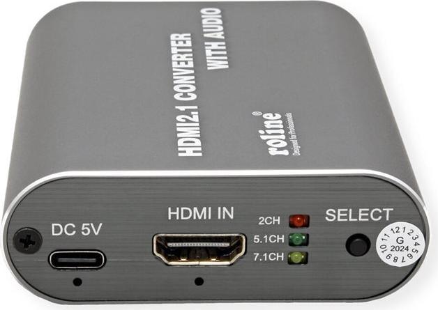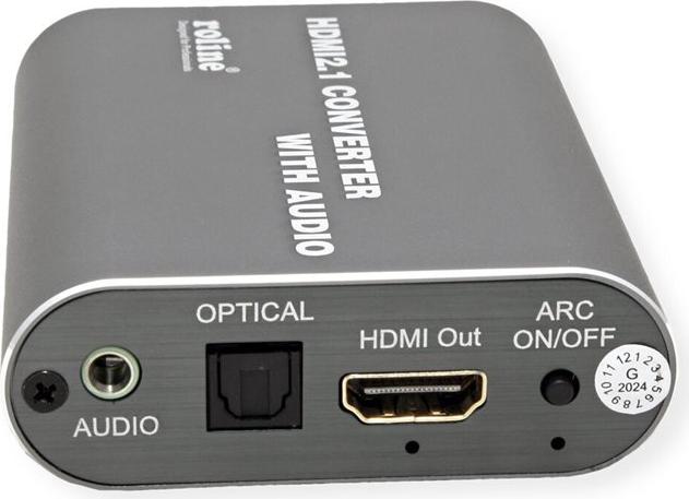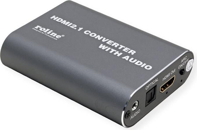Audio Signale extrahieren und an Heimkino-Anlage senden: Der ROLINE HDMI 8K Audio Extraktor erlaubt es, Audio-Signale aus dem HDMI-Signal auszukoppeln.Nicht alle Monitore verfügen über gute Lautsprecher. Mit dem Extraktor leiten Sie die Audio-Signale über S/PDIF (optisch) oder analog über 3,5mm-Anschlüsse an ein Lautsprecher-System, das reine Bildsignal geht zum Bildschirm. Unterstützt HDMI 2.1, HDCP 2.3 Unterstützt Bildschirm-Auflösung bis 8K@60Hz Maximale Bandbreite: 40Gbit/s Unterstützte HDMl Frequenz: LPCM bis 7.1, bis 192 kHz 24Bit S/PDIF TOSLINK Ausgang: LPCM bis 5.1, bis 96kHz 24Bit Stereo RCA Ausgangsformat: PCM 2.0 CH Der Audioausgang unterstützt 4 EDID Auswahlmöglichkeiten (2CH/5.1CH/7.1CH/TV).