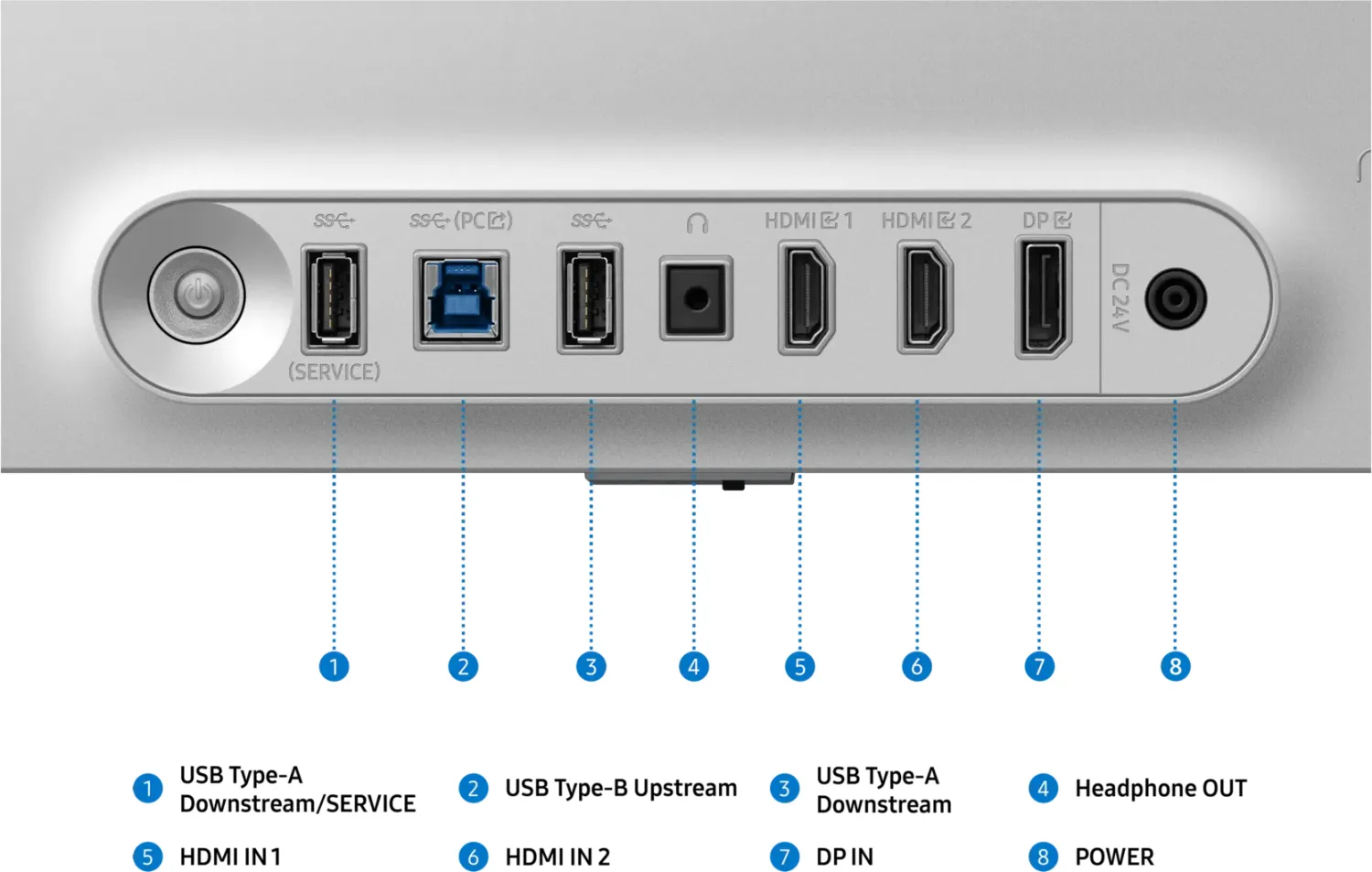 1x DisplayPort 1.4 (HDCP 2.2), 2x HDMI 2.1 (HDCP 2.2), 1x USB-B 3.0 (Upstream, 5Gb/?s), 2x USB-A 3.0 (Downstream, 5Gb/?s), 1x 3.5mm Klinke Line-Out, 1x DC-In Hohlbuchse (Netzanschluss) |
