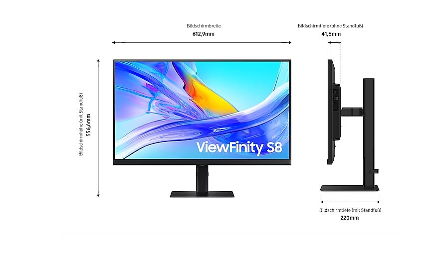 612.9x436.6x220mm (BxHxT) mit Standfuß komprimiert, 612.9x556.6x220mm (BxHxT) mit Standfuß ausgezogen, 612.9x367.7x41.6mm (BxHxT) ohne Standfuß |