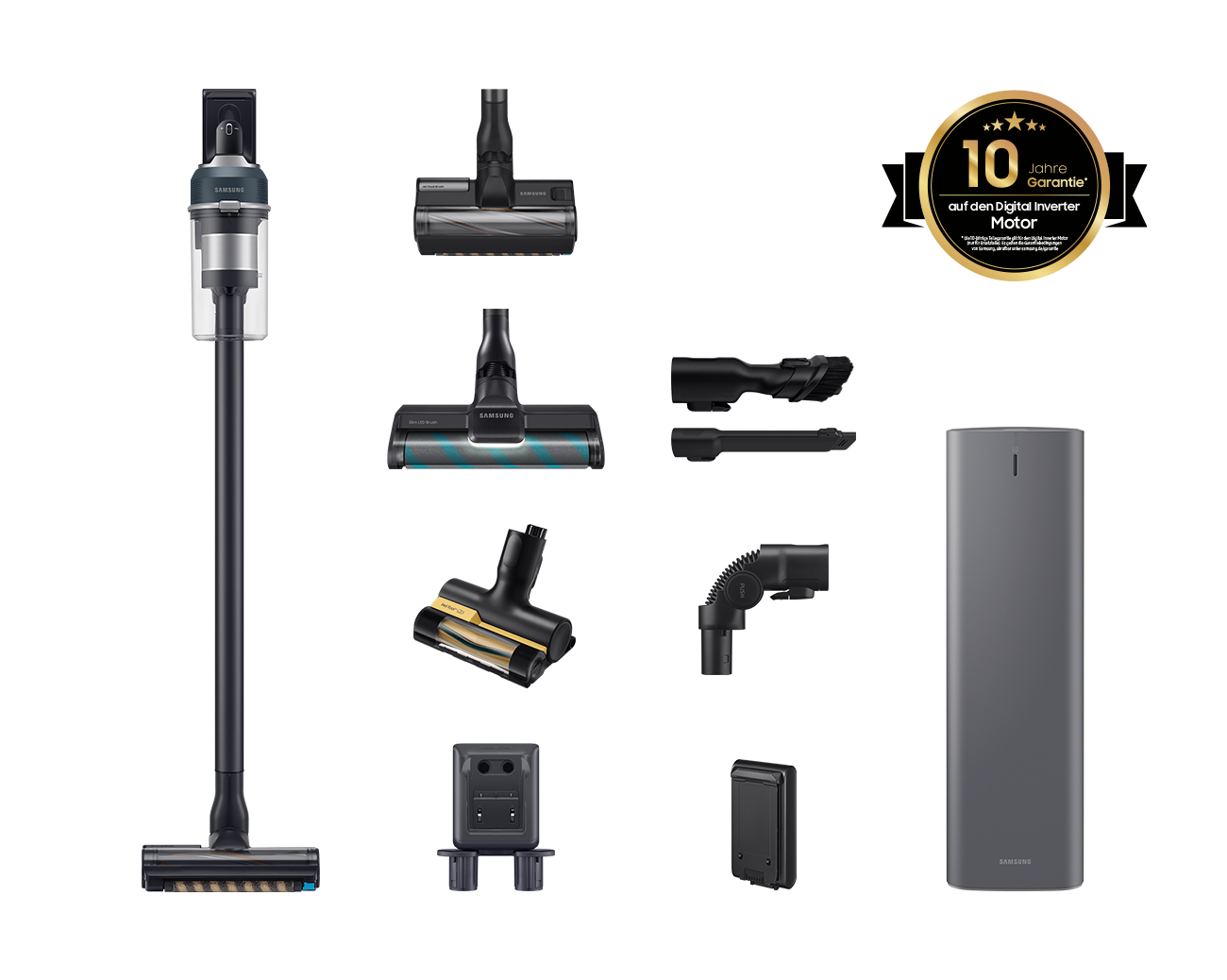 Clean Station, Jet Dual Bürste, Slim LED Bürste, Pet Tool+, 2-in-1 Kombidüse, Teleskop-Fugendüse, Flexible Tool, 1 Akku, 2-in-1 Ladestation, Netzteil |