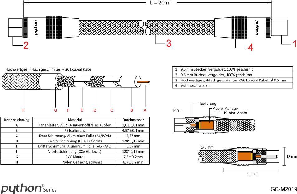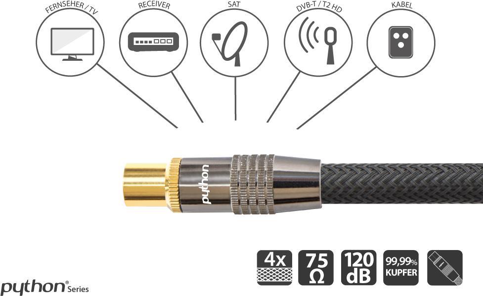 SAT Antennenkabel, IEC/Koax Stecker an Buchse vergoldet, Schirmmaß 120 db, 75 Ohm, Nylongeflecht schwarz, 20m, PYTHON® Series (GC-M2019)