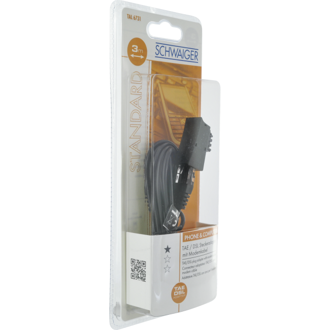Dieser SCHWAIGER Steckeradapter mit Modemkabel wird u.a. für den DSL-Anschluss von Telekom Speedport- oder Fritzbox-Modellen an der Telefondose eingesetzt.Produkttext[/head]Dieser SCHWAIGER® Steckeradapter mit Modemkabel wird u.a. für den DSL-Anschluss von Telekom Speedport- oder Fritzbox-Modellen an der Telefondose eingesetzt.[head]Hauptmerkmale