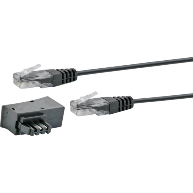 Dieser SCHWAIGER Steckeradapter mit Modemkabel wird u.a. für den DSL-Anschluss von Telekom Speedport- oder Fritzbox-Modellen an der Telefondose eingesetzt.