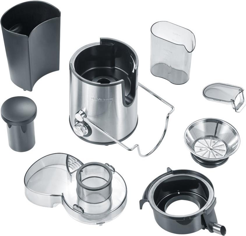 Da schwärmen auch Profis: Der kompakte Entsafter arbeitet mit zwei Geschwindigkeitsstufen und maximal 19.000 Umdrehungen pro Minute. Obst- und Gemüsesäfte fließen in den Auffangbehälter mit 500 ml Kapazität, ein Deckel trennt den Schaum vom Saft. Praktisch sind der breite Einfüllschacht mit 6 cm Durchmesser und der große Tresterbehälter.