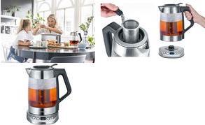 Ein Allround-Talent für deine Küche - Teekocher und Wasserkocher in Einem! Die Ziehzeit ist individuell einstellbar oder eines der 5 voreingestellten Teeprogramme nutzen, womit die Temperatur sowie die Ziehzeit perfekt auf jede Teesorte abgestimmt sind. Tee, Instantprodukte, Babynahrung und vieles mehr lässt sich wunderbar in diesem Küchengerät zubereiten. Die Temperatur lässt sich individuell einstellen und eine separate Warmhaltefunktion ermöglicht eine 30-minütige Temperaturspeicherung. Das Füllvermögen für Tee beträgt ca. 1,5 Liter und das Füllvermögen für Wasser 1,7 Liter. Das Gerät lässt sich außerdem sehr leicht reinigen und kann sich in seinem edlen, zeitlosen Design in jeder Küche sehen lassen.Produkttext[/head]„Easy Tea Select“ Funktion mit 5 voreingestellten Teeprogrammeneinstellbare Temperaturstufen: 40 °C – 100 °C in 5 °C-SchrittenTemperatur und Ziehzeit individuell einstellbar„ Be-Silent“ Funktion: Signaltöne können auf Wunsch deaktiviert/aktiviert werdeneinstellbare Ziehzeit: 1 – 15 Minuten mit Signalton nach beendeter Ziehzeithochwertige Edelstahl-Basis mit beleuchteten Bedientasten und LED Displayhochwertiges Gehäuse aus Edelstahl und temperaturwechselbeständigem Glasautomatische Warmhaltefunktion zur 30 minütigen Temperaturspeicherunghöchste Temperaturgenauigkeit durch feinfühligen integrierten Temperatursensor„Quick-Boil & Tea Funktion“ zur Auswahl von 100 °C oder Tee-Modus für Kräuter-Tee per einfachem Knopfdruckleichte Reinigung durch abnehmbaren Deckel und große Öffnungfeinmaschiger Teefilter aus Edelstahl mit Griff für eine sichere Bedienungautomatische Abschaltung360° central-cordless-system: kabellos aus jeder Richtung auf den Gerätesockel aufsetzbardurch Edelstahlplatte verdecktes HeizelementÜberhitzungsschutzAusgusszotterutschfeste GummifüßeKabelaufwicklung[head]Hauptmerkmale