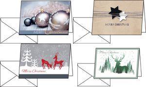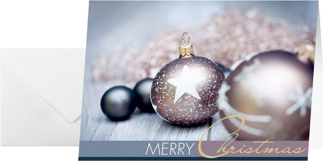 Weihnachts-Karten "Exquisite" auf Glanzkarton und mit steingrauen Weihnachtskugeln als zentralem Motiv. Die Grußkarten sind zum Bedrucken mit InkJet- und Laser-Drucker sowie zum ...