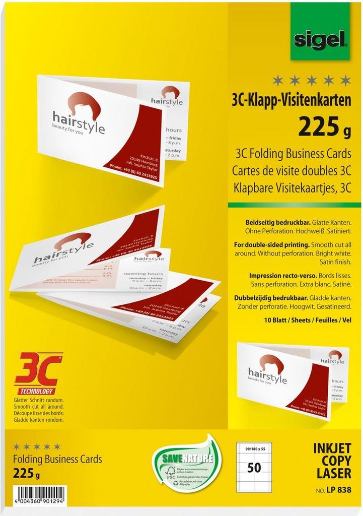 Beidseitig bedruckbare Klapp-Visitenkarten hochweiß, satiniert, mit einer Grammatur von 225 g/m2, FSC -zertifiziert, sind ideal zum schnellen und einfachen Gestalten und Drucken am eigenen PC und Drucker. Einfaches Heraustrennen durch 3C-Technologie: glatter Schnitt rundum ohne Perforation. Die Visitenkarten sind vielseitig einsetzbar beispielsweise für Events, Messen oder geschäftlichen und privaten Kontaktaustausch. Für alle InkJet- und (Farb-)Laser-Drucker sowie Kopierer geeignet. In der Packung sind 10 Blatt DIN A4 bzw. 50 Karten im Format 180x55 mm enthalten.