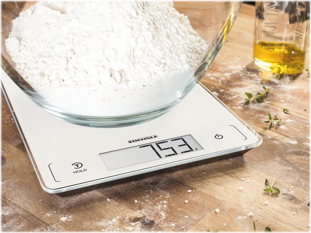 Wenn das Vergnügen nicht erst beim Essen, sondern schon bei der Zubereitung beginnt, ist die digitale Küchenwaage Page Profi 300 von Soehnle im Spiel. Ob extragroßes Display, extrahohe Tragkraft oder praktische Zusatzfunktionen wie die Hold-Funktion: Die Page Profi 300 überzeugt rundum mit ihrer Ausstattung. Durch die innovative HOLD-Funktion wird die Gewichtsanzeige für 10 Sekunden eingefroren - bei einer Tragkraft von bis zu 20 kg superpraktisch. So können auch sehr große Gegenstände, die den Blick auf das Display versperren, bequem abgewogen werden. Angezeigt wird das Gewicht auf der extragroßen, weiß leuchtenden LCD-Anzeige in 1-g-Schritten und ist daher auch bei schwierigen Lichtverhältnissen bestens lesbar. Für eine komfortable Bedienung ist die Page Profi 300 außerdem mit zwei Sensor-Touch-Feldern ausgestattet, die bereits auf leichte Berührung reagieren.