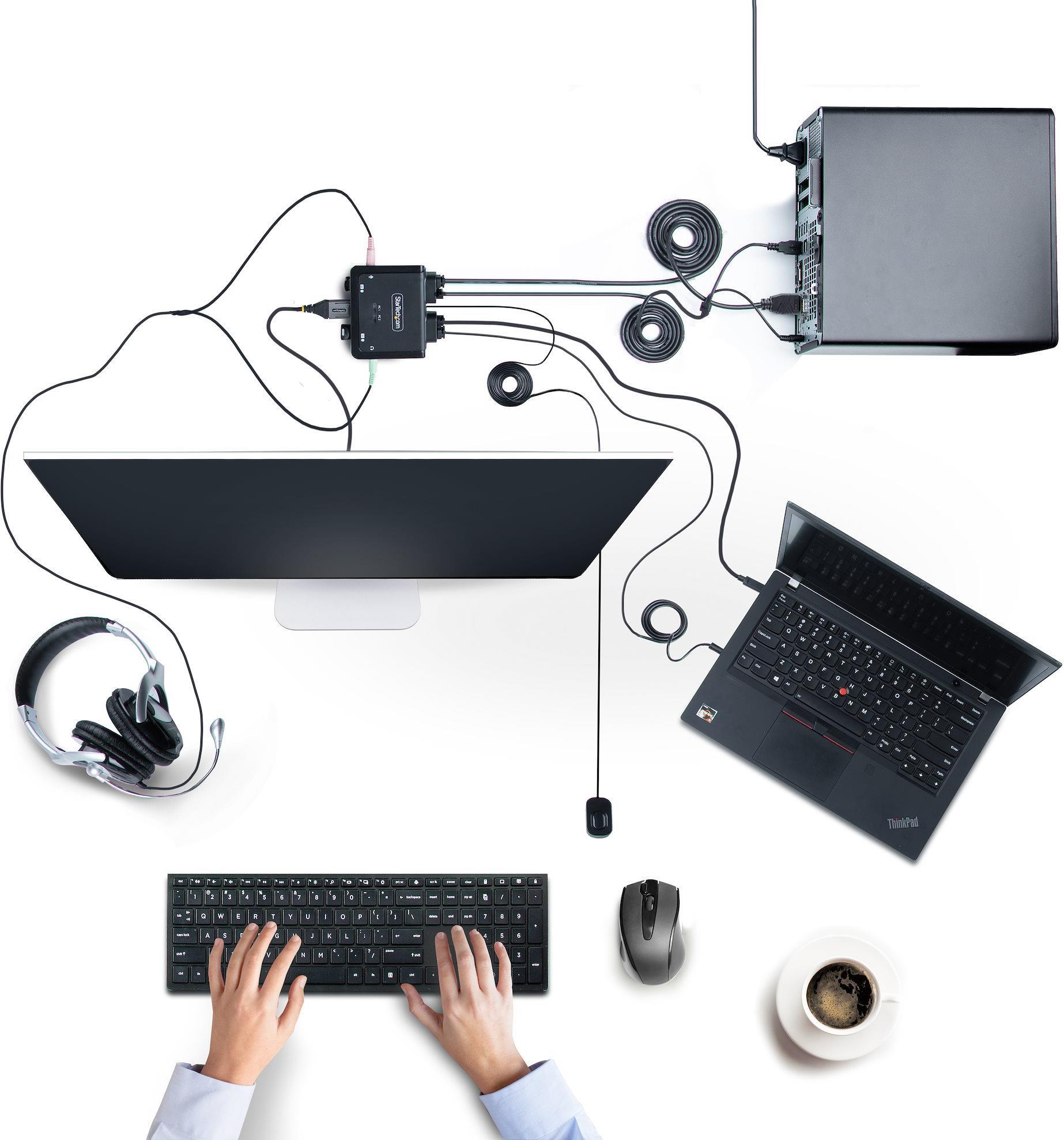 Dieser Hybrid KVM-Switch ermöglicht Benutzern, zwischen einem USB Typ-A und HDMI-fähigen Desktop und einem USB Typ-C (DP Alt-Modus) Laptop zu wechseln, um Tastatur, Maus, Audio Eingabe-/Ausgabegeräte und einen einzelnen 4K 60 Hz HDMI Monitor zu teilen.