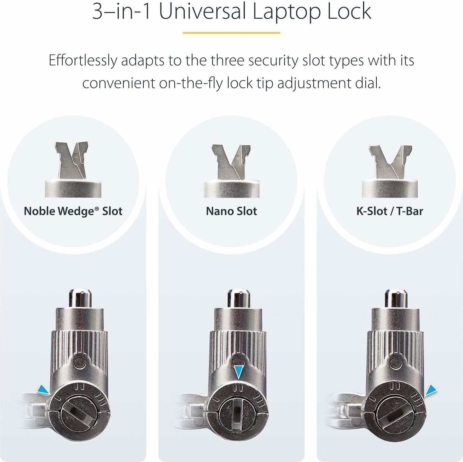 Ein einzigartiger Mechanismus ermöglicht eine schnelle Anpassung der Schlossspitze an verschiedene Sicherheitsschlitze. Drehen Sie einfach das Schlossauswahlrad, um die Form der Schlossspitze an den Sicherheitsschlitz anzupassen, ohne zusätzliches Werkzeug zu benötigen oder separate Schlossspitzen mitzuführen. Das schnittfeste Sicherheitskabel aus Stahl ist 2m lang und bietet Reichweite und Haltbarkeit.