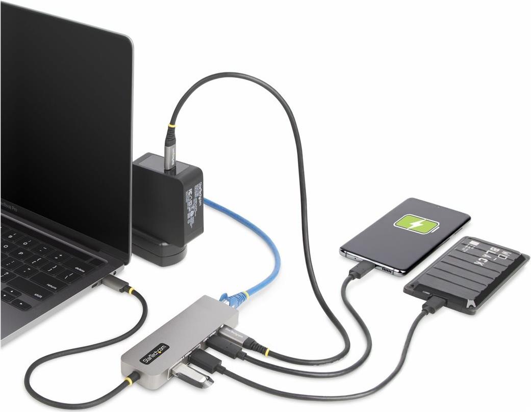 Dieser USB Typ-C Hub mit 2,5Gigabit Ethernet und 100W USB Power Delivery Pass-Through erweitert einen USB-C-fähigen Computer um drei USB 3.2 Gen 2 (10Gbps) Ports (2x USB-A, 1x USB-C). Schließen Sie den USB-Hub über das integrierte 30 cm lange USB-C-Hostkabel an einen USB-C-Anschluss eines Laptops an. Laden Sie einen Host-Laptop auf, indem Sie das USB-C-Netzteil des Host-Laptops an den USB Power Delivery (PD) 3.0-Anschluss anschließen. Die Abwärtskompatibilität mit USB 2.0-Geräten (480 Mbit/s) gewährleistet die Unterstützung einer breiten Palette moderner und älterer USB-Peripheriegeräte.
