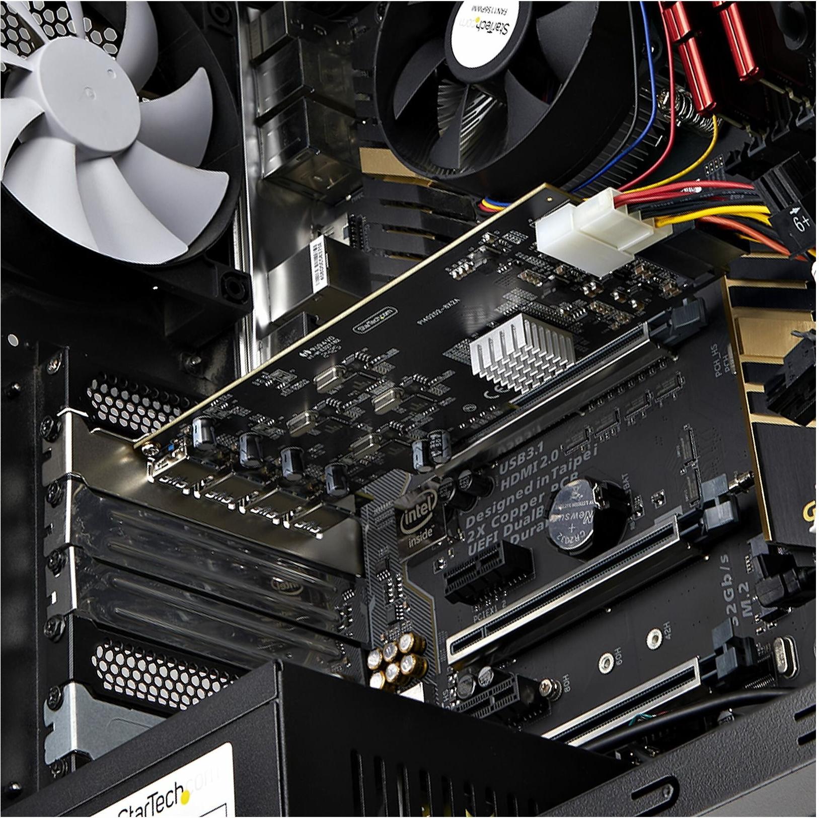 Rüsten Sie oder erweitern Sie die USB-Konnektivität eines Desktop-Computers oder Servers, indem Sie vier unabhängige USB-Anschlüsse vom Typ A mit 5Gbps über eine einzige PCI Express 2.0 x4-Verbindung hinzufügen.