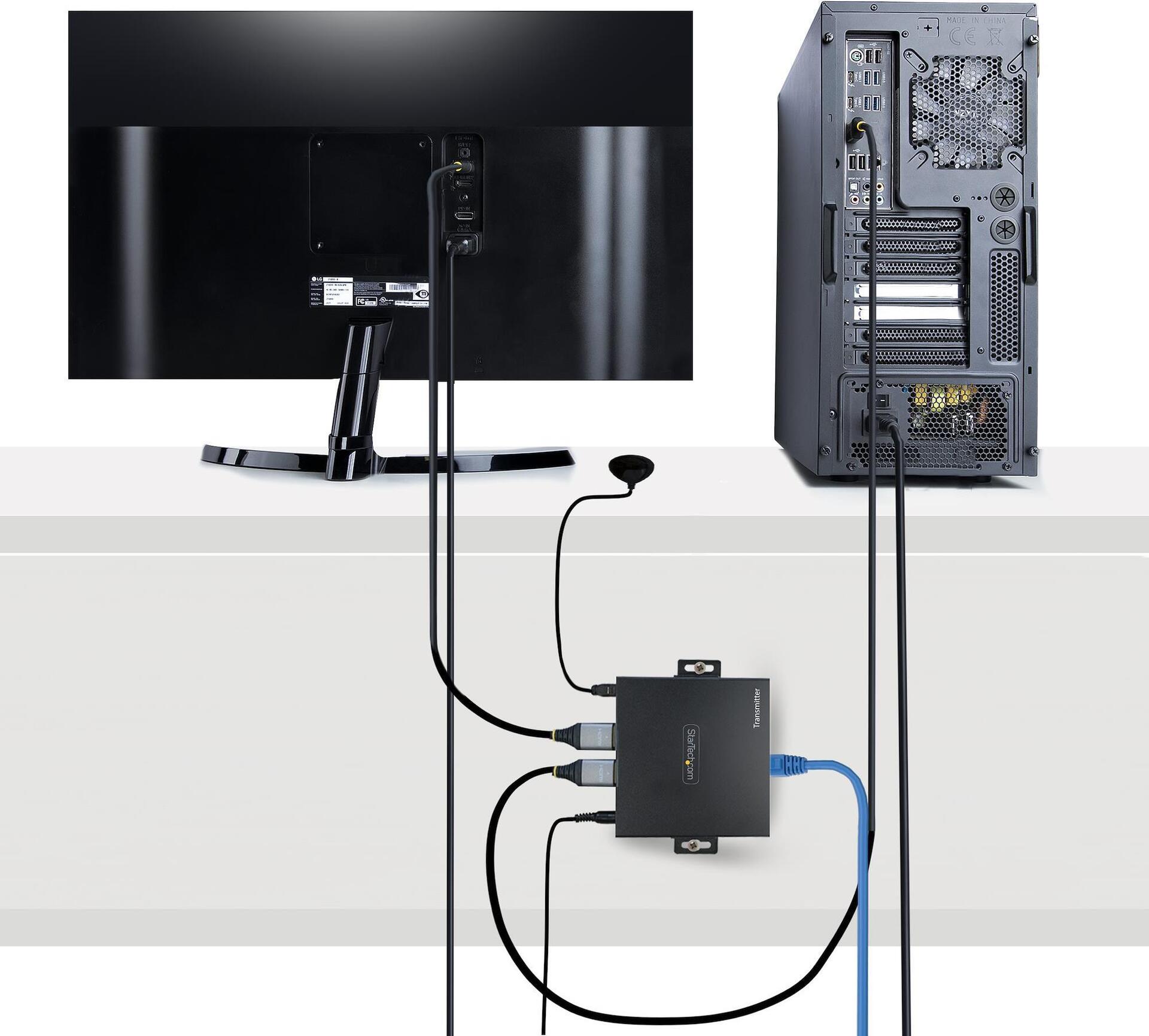 Dieser HDMI Extender überträgt ein 4K 60Hz HDMI Audio Video Signal bis zu 70 m über Cat 5e/6 Ethernet Kabel. Das Konverter Kit umfasst die Sender und Empfänger für eine komplette Punkt-zu-Punkt Lösung.Produkttext[/head]Verlängern Sie ein HDMI® Audio-Video Signal bis zu 70m, mit Power-over-Cable und Auflösungen bis zu 4K 60HzDieser HDMI® Extender überträgt ein 4K 60Hz HDMI Audio Video Signal bis zu 70 m über Cat 5e/6 Ethernet Kabel. Das Konverter Kit umfasst die Sender und Empfänger für eine komplette Punkt-zu-Punkt Lösung.4K 60Hz AuflösungDieser HDMI Extender unterstützt Auflösungen von bis zu 4K 60Hz mit null Latenz über ein einziges Ethernet Kabel. Der UHD HDMI Extender unterstützt HDMI 2.0 und 4:4:4 Chroma Subsampling, was einen klaren und stabilen Video Ausgang gewährleistet.Power-Over-CableVerbinden Sie den Netzteiladapter mit dem Sender oder der Empfängereinheit, um beide Einheiten über Power-over-Cable (PoC) mit Strom zu versorgen. Verwenden Sie eine IR-Fernbedienung, um vom Standort der Empfängereinheit aus mit der Quelle zu kommunizieren, inkl. IR-Verlängerungskit.Vielseitige Installations MöglichkeitenDer 4K HDMI Extender verfügt über einen HDMI Ausgang an der Sendeeinheit, der den Anschluss eines HDMI Bildschirms oder den Anschluss zusätzlicher Video Extender ermöglicht - um eine Kaskadenverbindung zu erstellen. Plug-and-Play Installation ohne zusätzliche Software oder Treiber. Das Gehäuse kann mit Hilfe der Montagebügeln an der Wand, der Decke oder an der Unterseite eines Tisches befestigt werden, was eine Vielzahl professioneller Installationsmöglichkeiten bietet. Die Gummifüße schützen die Montagefläche und isolieren die Geräte von Vibrationen.Dieses Produkt wird 2 Jahre lang unterstützt und enthält lebenslang einen kostenlosen, mehrsprachigen technischen Kundendienst (24/5).The StarTech.com Advantage[head]Hauptmerkmale