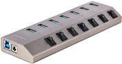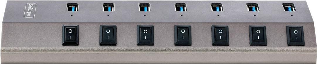 Dieser 7-port USB 3.2 Gen 1 (5Gbit/s) Hub fügt einem Computer sieben USB Typ-A Anschlüsse hinzu, wobei jeder Anschluss über einen individuellen Ein/Aus Schalter verfügt. Der USB Hub wird über einen inklusiven Netzteil Adapter mit Eigenstrom betrieben. Er wird mit einem USB-A oder USB-C Anschluss an einem Laptop oder Desktop Computer verbunden.