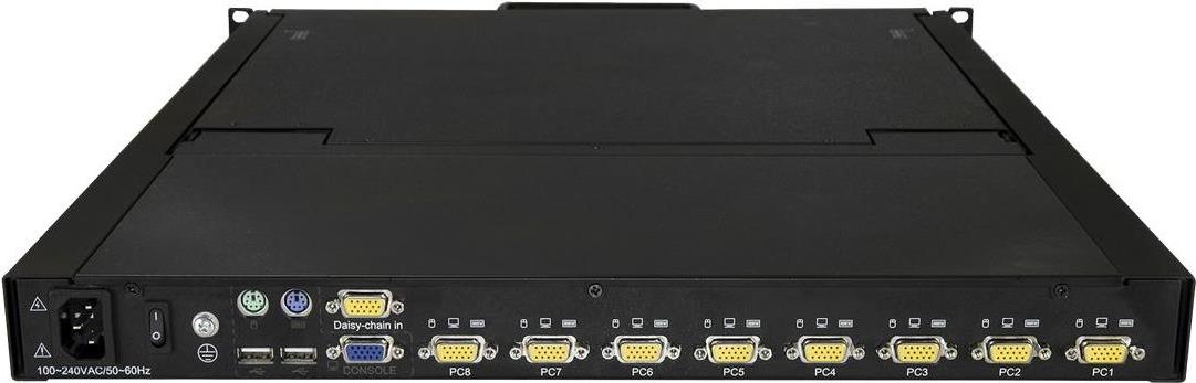 Diese KVM-Konsole für die Rackmontage bietet vollständige Steuerung über Tastatur, Monitor und Maus für acht Computer. Die Rack-Konsole wird findet in 1 HE eines Racks Platz und stellt eine platzsparende Lösung für eine vollständige Konsolensteuerung dar.