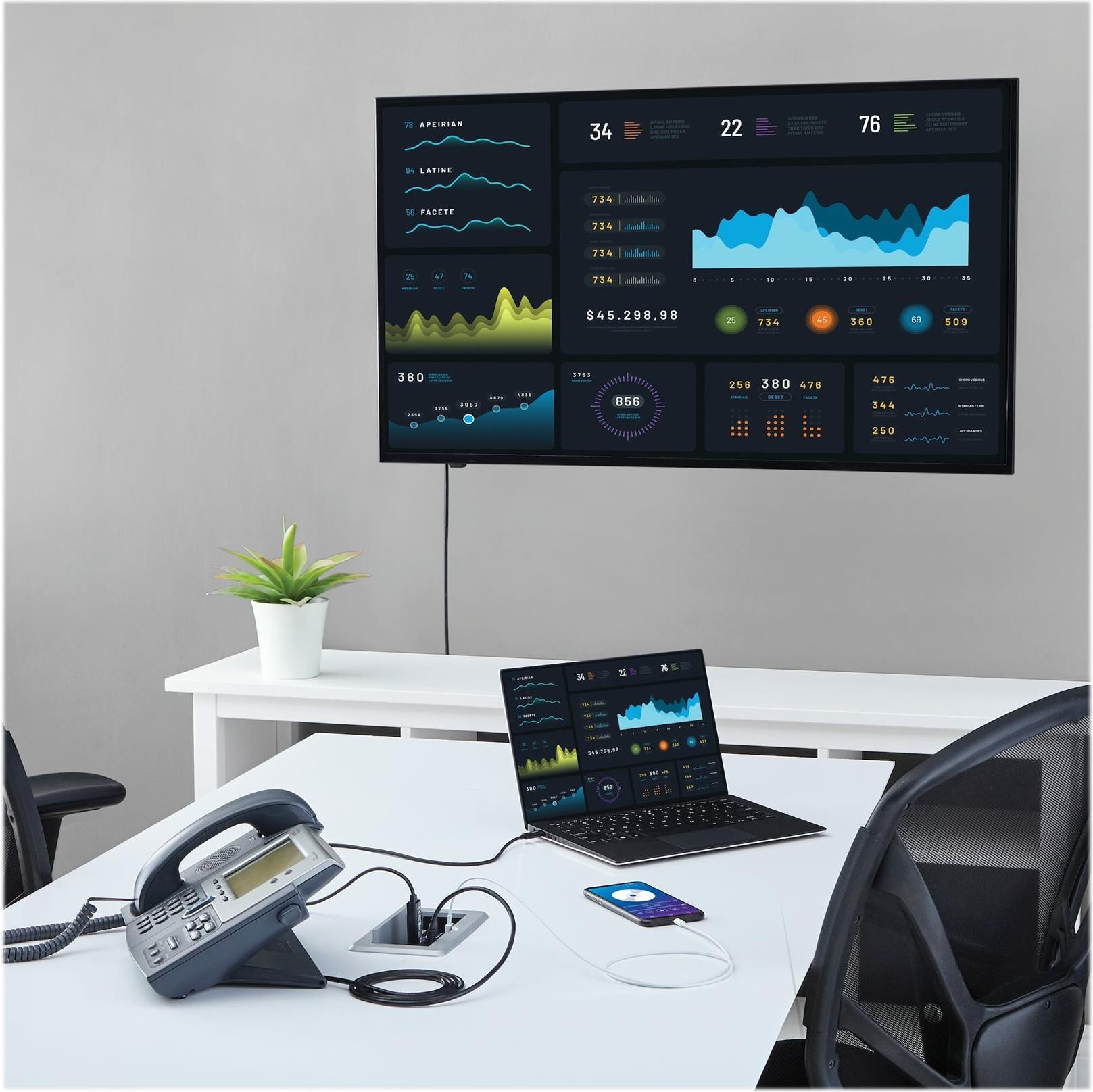 Diese Konnektivitätsbox für Konferenztische ermöglicht A/V-Installationen im Konferenztisch oder Rednerpult zur Bereitstellung von A/V-, Netzwerk- und USB-Ladeanschlüssen in Ihrem Konferenzraum, Auditorium oder Klassenzimmer. Das Gehäuse erleichtert das Anschließen von Laptops mit HDMI-, DisplayPort- und VGA-Anschlüssen an das große HDMI-Display im Raum und bietet LAN- und USB-Anschlüsse zum Laden von USB-Geräten. Die Box bietet auch Kabelmanagement für den Konferenzraum, da Anschlusskabel im Tisch untergebracht werden können.