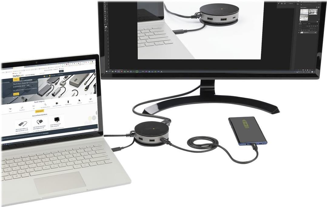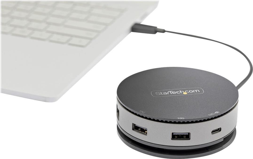 Dieser USB-C Gen 2 10 Gbit/s Multiport-Adapter mit abwärtskompatibler USB-C-Laptop-Kompatibilität verwandelt Ihr USB-C - oder Thunderbolt 3-fähiges Windows-Notebook, MacBook Pro, iPad Pro, Surface, Chromebook oder Android-Tablet in eine vollwertige Workstation, wo immer Sie auch sind. Der USB 3.2 Gen 2 Type-C-Hub-Adapter verfügt über ein einzigartiges tragbares, rundes Design und alle wichtigen Anschlüsse • HDMI, DisplayPort, VGA-Videooptionen • 10 Gbit/s USB-C &USB-A-Peripherie-Anschlüsse • Angeschlossenes 24 cm USB-C -Hostkabel.