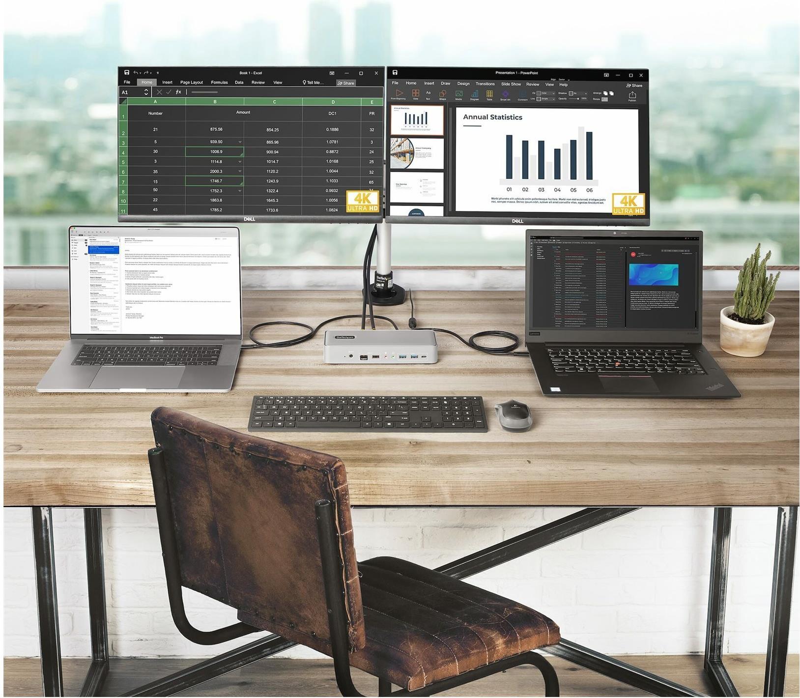 Schließen Sie zwei USB-C Computer an dieses Dock an, um auf eine Vielzahl von Anschlussmöglichkeiten, Optionen und Funktionen zuzugreifen. Das Dock bietet