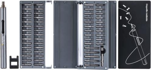 Dieser kabellose Schraubendreher ist das ideale Werkzeug, um elektronische Geräte bei der Reparatur zu demontieren und wieder zusammenzubauen. Dieses batteriebetriebene Set umfasst einen elektrischen Präzisionsschraubendreher (2x AAA-Batterien im Lieferumfang enthalten), 55 Mikrobits, einen Magnetisierer/Entmagnetisierer sowie eine magnetische Arbeitsunterlage, alles untergebracht in einem robusten Hartschalenkoffer. Eine vollständige Auswahl an Bits sorgt für Kompatibilität mit den meisten gängigen Marken von Smartphones, Tablets und Laptops, unter anderem Apple iPhones, iPads, Macbooks, Samsung Galaxy, HP und Acer Chromebooks sowie Lenovo ThinkPads.