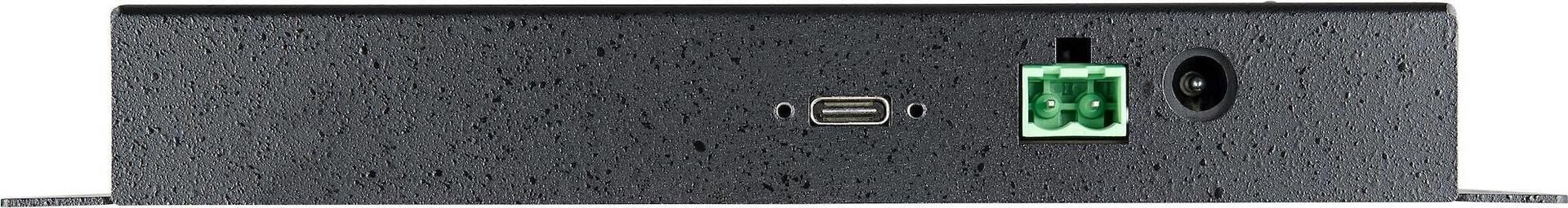 Dieser USB-Hub verfügt über ein robustes Metallgehäuse mit integrierten Montagewinkeln, sodass Sie ihn an jeder Wand oder Oberfläche montieren können. Der Hub verfügt über 15 kV Luft- und 8 kV-Kontaktelektrostatikschutz (ESD) und 350 W Überspannungsschutz. Jeder Anschluss am Hub verfügt über einen Stecker mit Feststellschraube, wodurch ein versehentliches Trennen des Kabels vermieden wird. Außerdem ist ein 1 m langes USB-C und USB-A Hostkabel mit Feststellschraube im Lieferumfang enthalten.