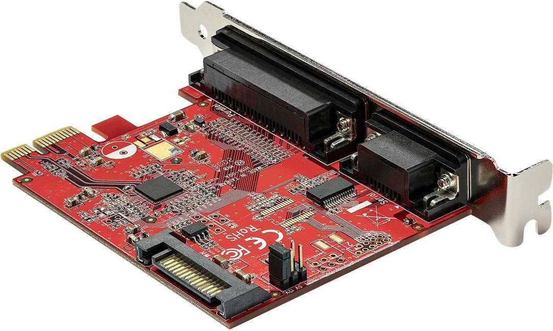 Der Asix AX99100-Chip ermöglicht außerdem den Anschluss eines DB9 Geräts über dieselbe Controller-Karte und ist mit dem Industriestandard 16950 UART kompatibel. Der serielle Anschluss ist perfekt für den Anschluss von Point-of-Sale-Terminals, seriellen Druckern, speicherprogrammierbaren Steuerungen (SPS), Steuerungen/Automatisierungen in Fabriken, wissenschaftlichen Sensoren, medizinischen Geräten, Scannern und Oszilloskopen. Der serielle (COM)-Anschluss unterstützt bidirektionale RS232 Geschwindigkeiten bis zu 921,6 Kbit/s pro Anschluss, bietet einen 256 Byte FIFO-Puffer und ein neuntes Datenbit. Die Karte verfügt außerdem über einen optionalen SATA-Netzeingang, über den Sie Pin 9 am seriellen Anschluss mit Strom versorgen. Über einen Jumper an der Leiterplatte kann eine Ausgangsleistung zwischen 5 V und 12 V eingestellt werden.