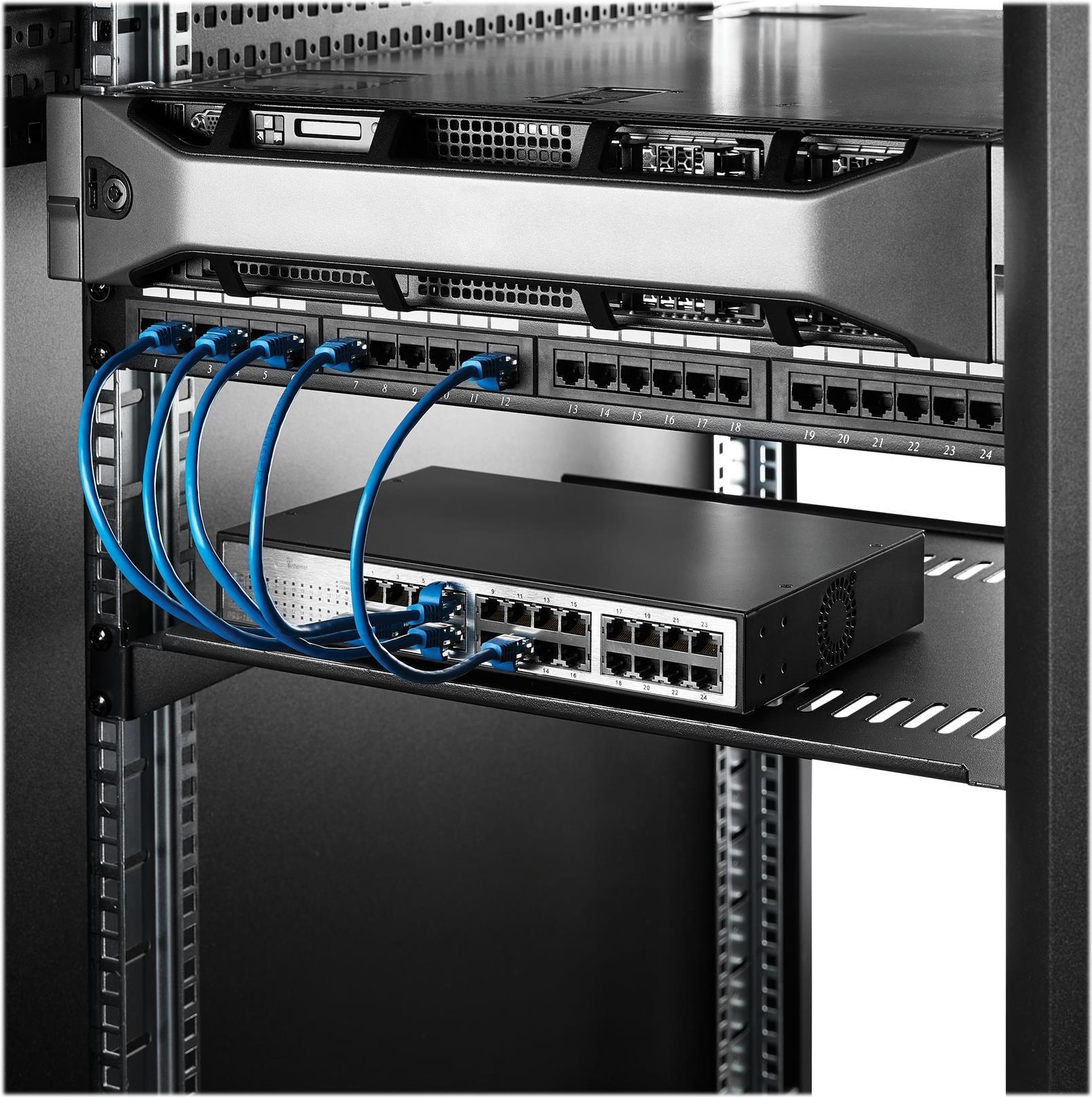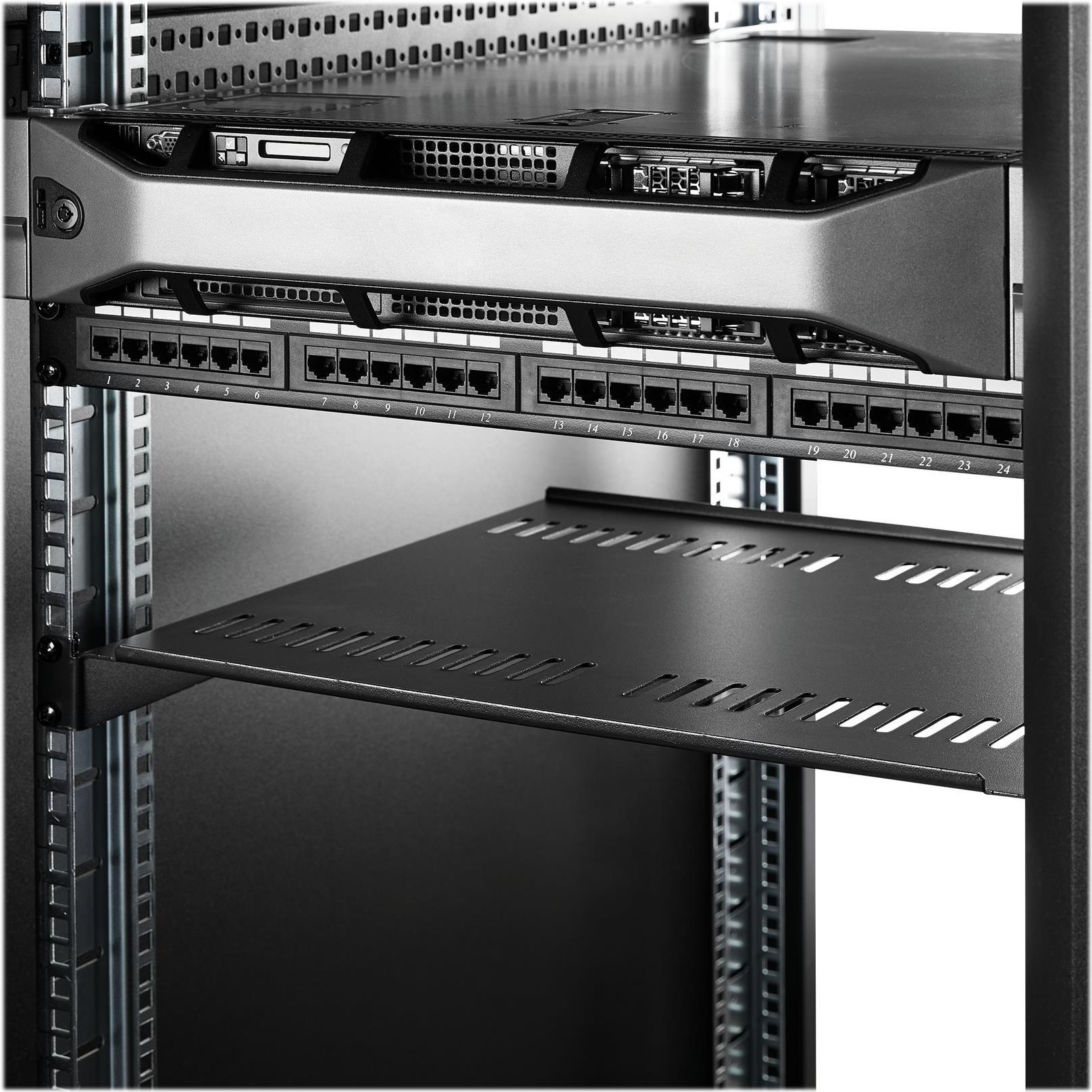 Mit diesem 1-HE-Rack-Fachboden ergänzen Sie EIA-310-konforme Server-Racks oder -Schränke um 40 cm flachen Stauraum. Das belüftete Design verbessert die Luftzirkulation und verringert die Temperatur in Ihrem Rack.