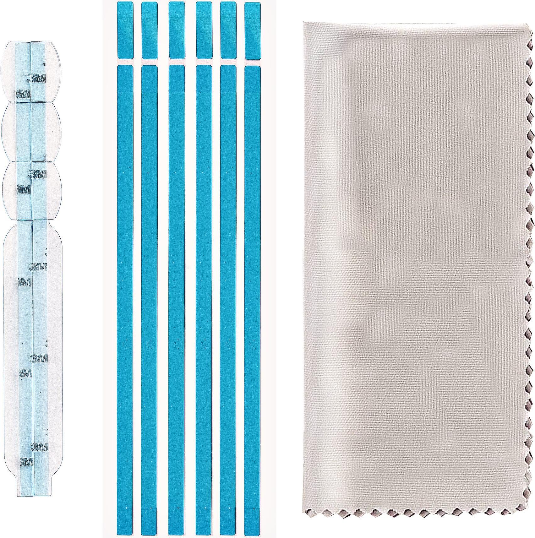 Reinigungstuch, 6 große Klebestreifen, 8 kleine Klebenstreifen, 2 große Befestigungslaschen, 6 kleine Montagelaschen |