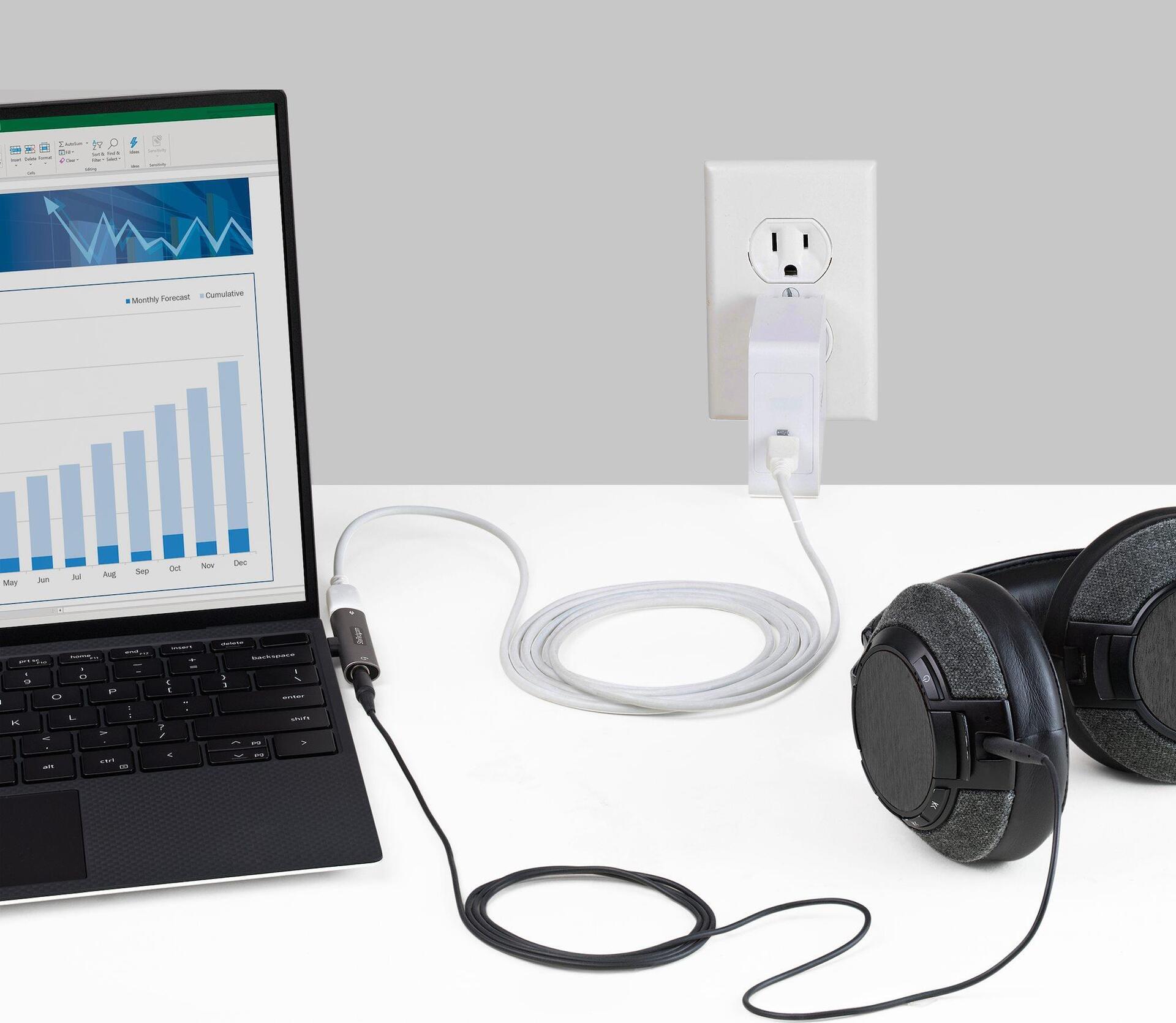 Mit diesem USB-C-Audioadapter mit 60 W Power Delivery können Sie den USB-C Anschluss Ihres Geräts in eine 3,5 mm-Audio-Buchse umwandeln und gleichzeitig Ihren Laptop, Tablet oder Ihr Smartphone aufladen.
